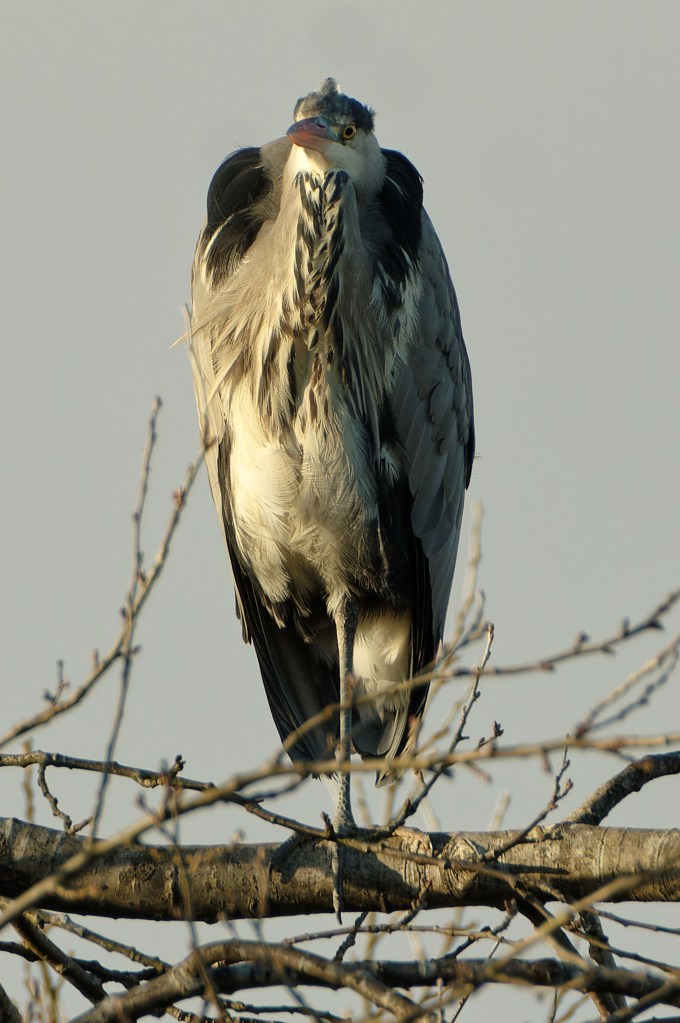 Backwoodsman took up a position on the small viewing platform which overlooks the reedy inlet from the canal. The platform looks a bit like a Juliet balcony; anyone standing on it definitely looms, so stillness and silence are essential if anything lurking in the reeds is likely to feel confident enough to emerge for very long. A Grey Heron looked down on Backwoodsman’s folly from its perch across the canal.