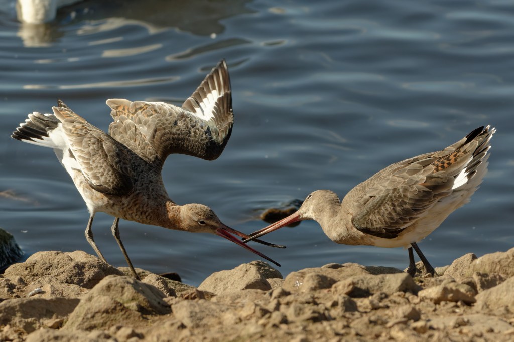 In front of the Discovery Hide, the Black-tailed Godwits were in a testy mood with bill-to-bill combat rife. The books don’t help much with this; while the excellent Waders by W. G. Hale describes the Godwit display behaviour, and refers to territory defence, it does not describe what Backwoodsman witnessed.