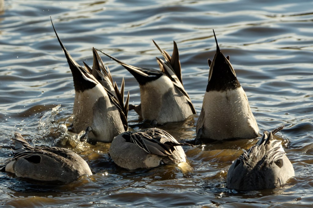 Getting right on top of them in a hide and in good light rather changed the game. There were Pintail on the wing (the first image in the post) and in repose, Pintail sailing around looking elegant, and then groups of them upending.