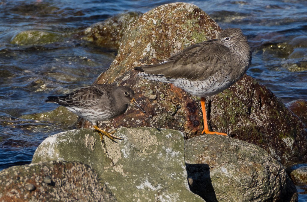 We used to see Purple Sandpipers regularly at Troon on the Ballast Bank, our main place for the species, back in the day before the invasion by the Troon Tadpoles. Backwoodsman had taken a few pictures there but was stranded short of enough material for a post, and had begun to despair of seeing these pretty little waders again. The odd bird would turn up at Stevenston or Saltcoats but they were always distant. For example, this shot is a long range effort taken at Stevenston Point; the size contrast with the Redshank is quite striking.