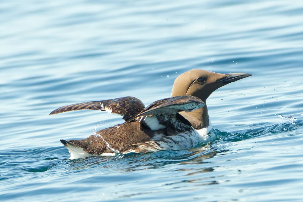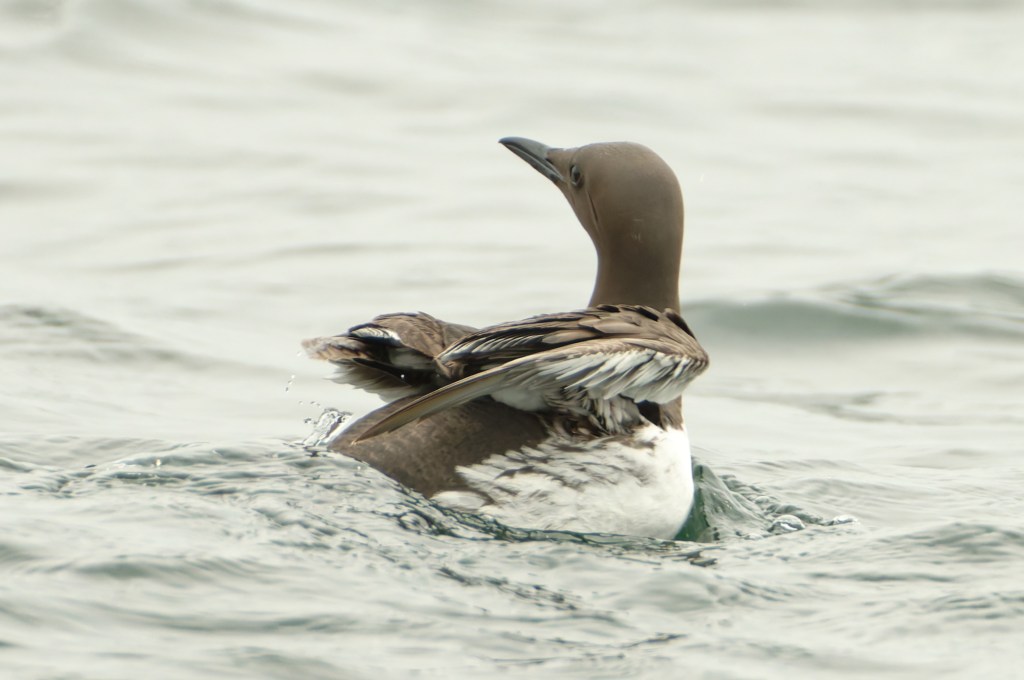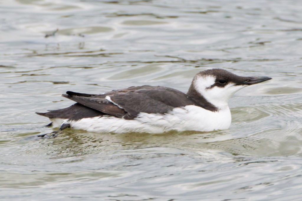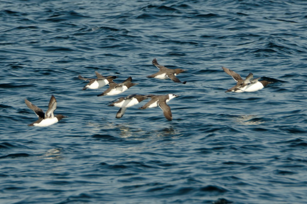 A recent trip solved the problem. On a Saturday in mid-April, we had taken an early train from Glasgow Central to Gourock and boarded the ferry to Dunoon. It was a brilliant morning, and flat calm. The crew member collecting fares took note of the camera and spoke of dolphins on the inbound voyage. Backwoodsman scanned the middle distance; there were no cetaceans to be seen but small groups of Guillemots were flying low across the water, heading east and further into the mouth of the Clyde. This is a long-range shot made more difficult by the speed of the vessel in one direction and the birds in the other.