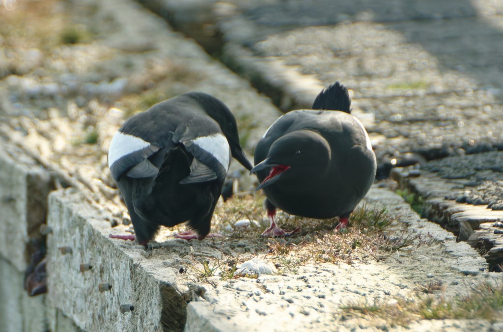 The vessel docked, the handful of passengers disembarked, and a larger group of gaudily-clad racegoers heading for the Scottish Grand National in Ayr boarded the empty vessel. We looked around the pier, initially hearing, and then seeing Black Guillemots courting.