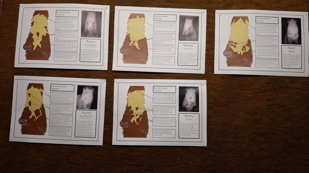 If you read the Red Squirrels post, you should know that the Aigas offer also included Pine Martens. Backwoodsman had never set eyes on one of these creatures before our May trip and was keen to get some pictures. We were offered an after-dinner private trip to the Quarry Hide with one of the wardens, and took up the opportunity with great enthusiasm. Bait was placed, lights were turned on and we took our places in the comfortable hide and waited in stillness and silence. The light fell, various creatures rustled in the grass but of Pine Martens, there were none. After a couple of hours, the vigil was called off and everyone exhaled. When the lights went back on in the hide, we were able to read about the role bib patterns play in identifying individual animals, and the cunning way in which images had been obtained.