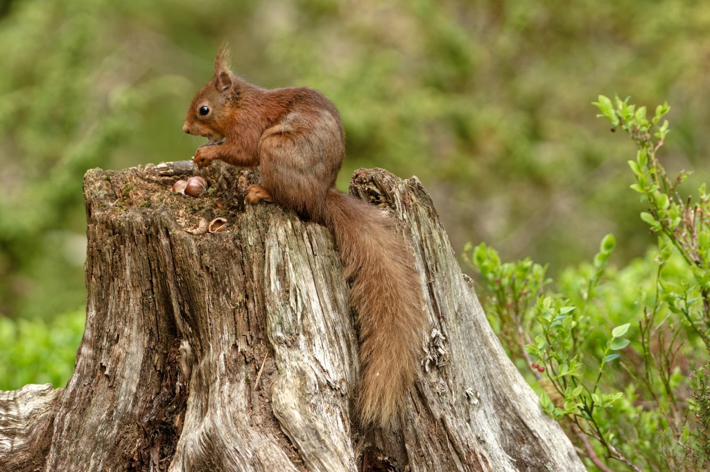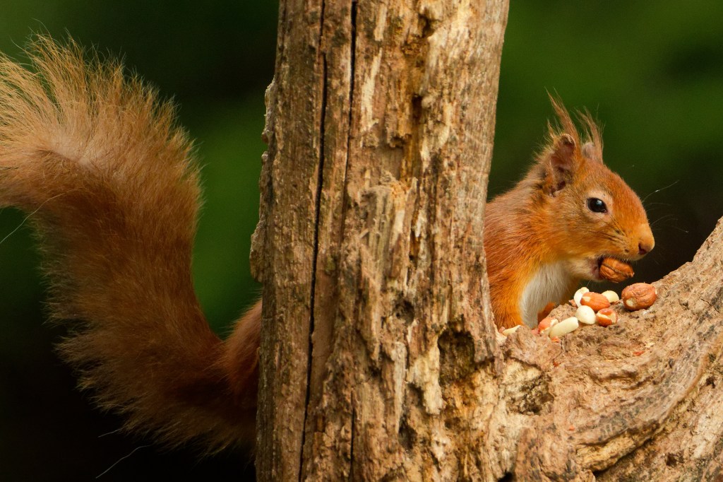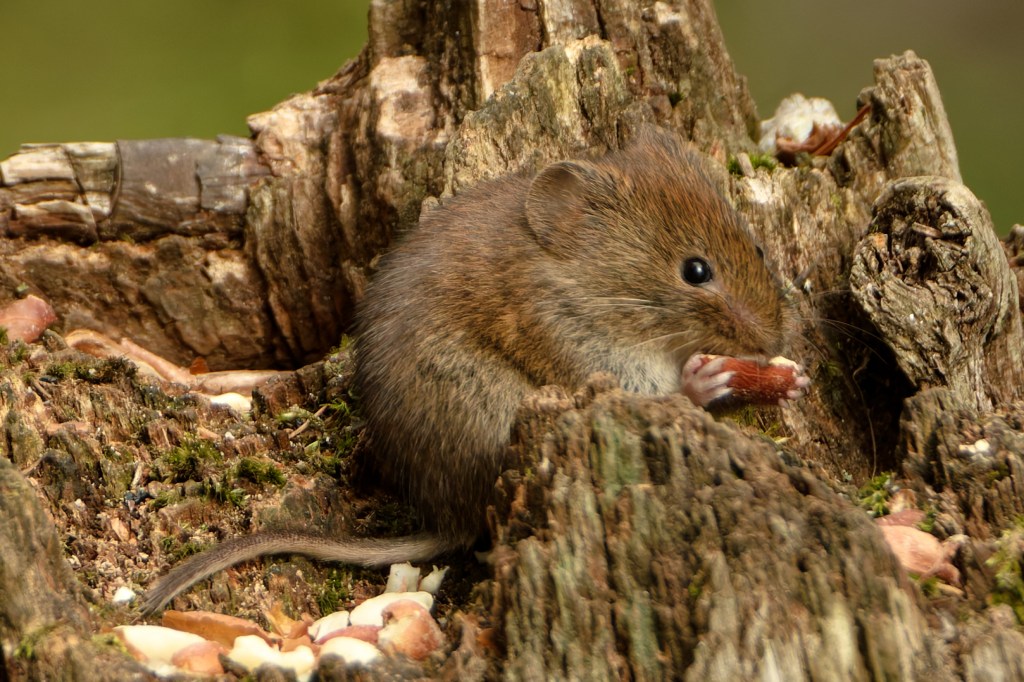 Backwoodsman will return to the vexed question of “Rewiring Britain” later on but before that, here is what we went for. The Aigas Estate is managed for wildlife and many Red Squirrels live on the property. While these rodents abound in Scotland, they are usually far too quick for Backwoodsman’s camera but not this time. The Pinewood Hide at Aigas offered the opportunity to lay traps; a bin in the corner of the hide contained shelled peanuts and whole hazelnuts. The latter could be shelled and served (fast food) or presented whole in their shells. A squirrel would take longer to scoff a nut in its shell, and might do some cute stuff with its little hands while it ate. Backwoodsman is an angler and spends a lot of time thinking about multiple lines and how to feed them to attract fish in different ways (usually unsuccessfully), so off we went with some peanuts here and hazelnuts there and there. A Vole was clearly watching this caper – they are very fast but like eating. Even wild animals are not daft – they know where the food is going to go in and they watch those lines. Perhaps you would argue that these animals are becoming, or have become, semi-domesticated?