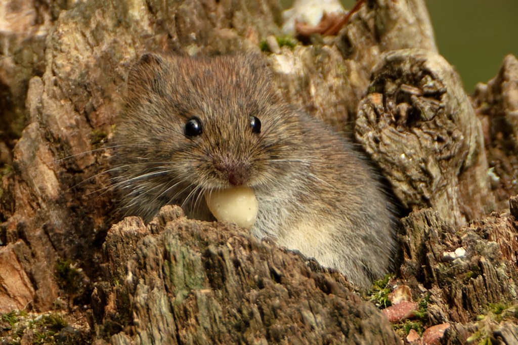 A poster in the hide identified this tiny rodent as a Field Vole. Backwoodsman’s copy of the book Britain’s Mammals (p. 72 of the updated 2021 edition) suggests that Field Voles and Bank voles can be distinguished by tail length and degree of hirsuteness of their ears. In this image, the tail is half the length of the body, spot on for a Field Vole, but in all these images, the ears seem quite prominent and really not hidden in the fur. Backwoodsman will defer to the local expertise.
