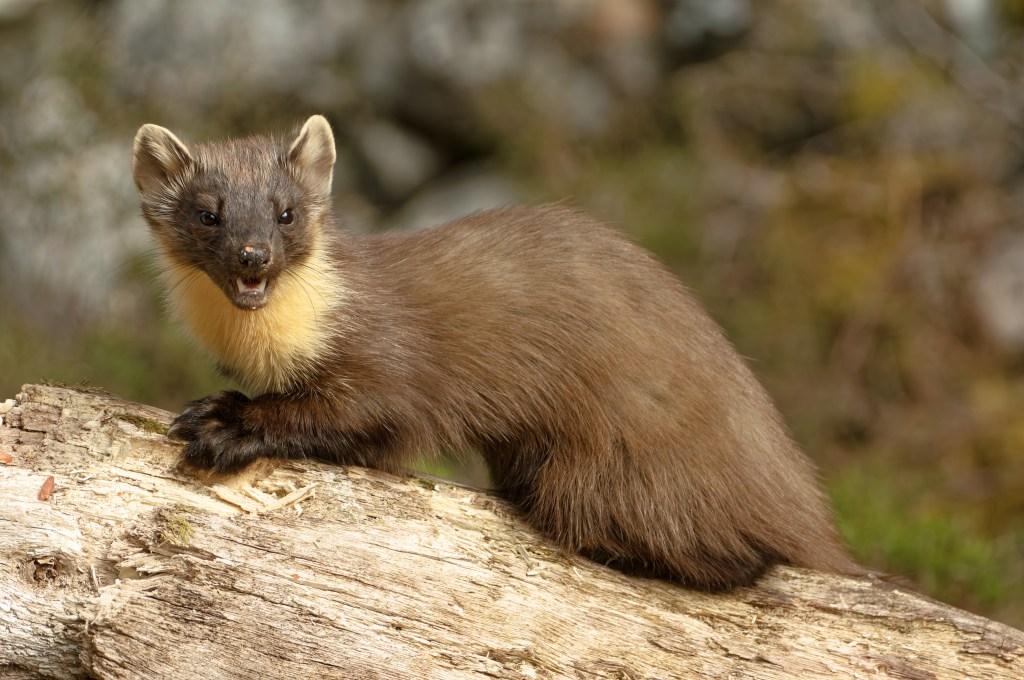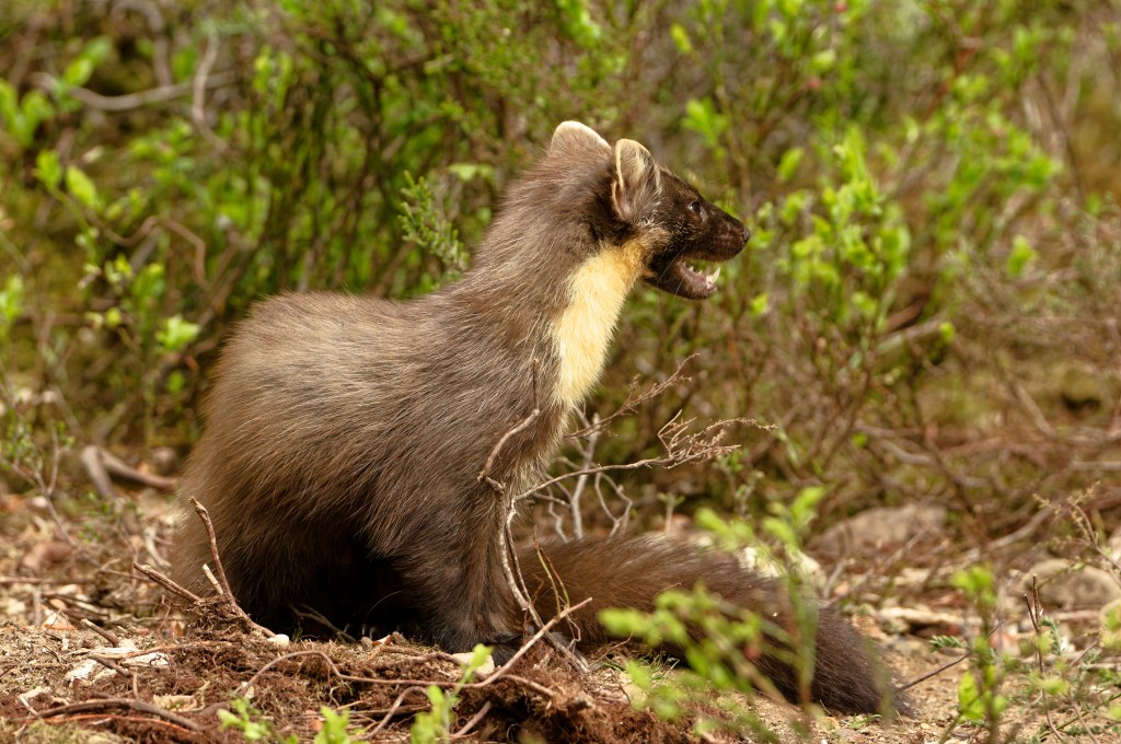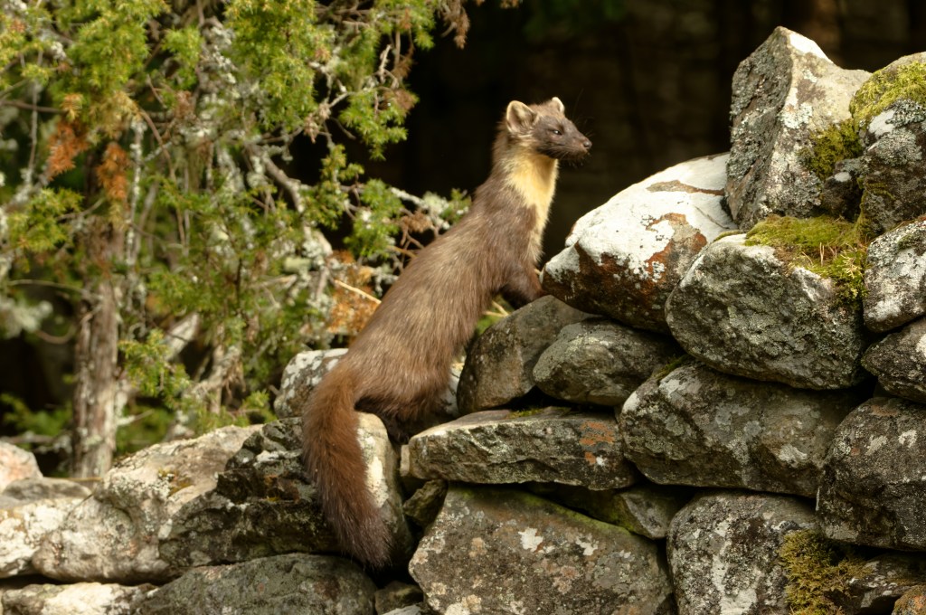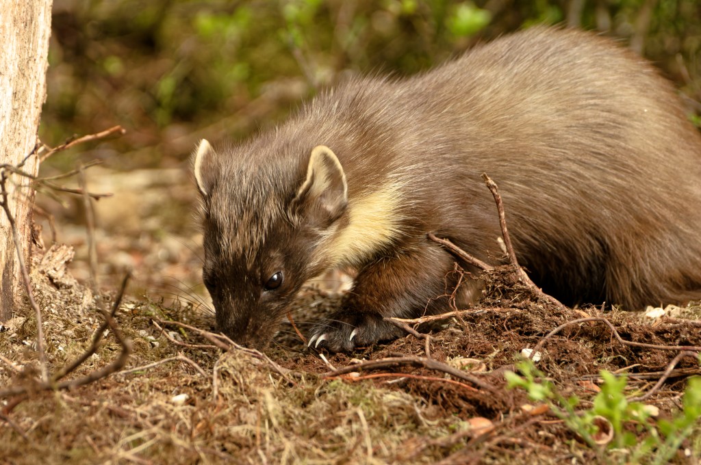 “The pine marten was once widespread and common across Britain but is now rare and recovering. Pine martens are generalist omnivores, eating a wide range of different food species. They predominantly prey on small mammals such as field voles, and this usually consists of up to 50% of their diet. Their diet preference is determined by what is locally most abundant. Predators are a crucial part of a functioning ecosystem. A diverse predator community is expected to naturally limit populations of abundant prey populations. However, pine martens by themselves generally live at low density; a population of one per km2 is considered a high density, and a pair of martens generally need at least 200 ha of suitable woodland.”