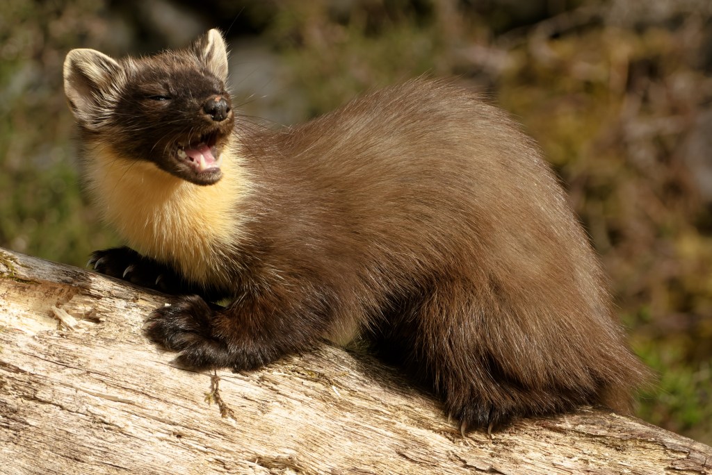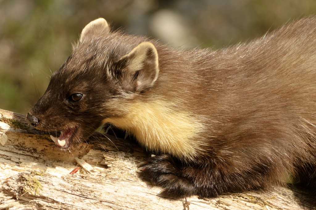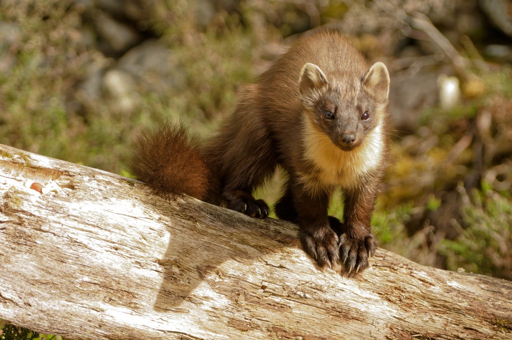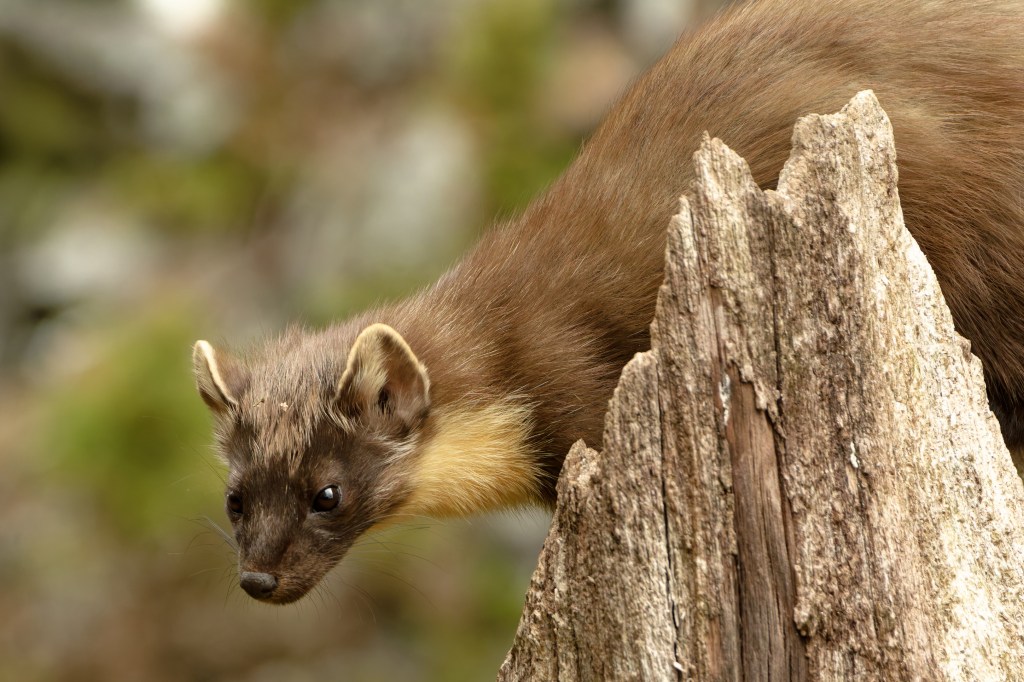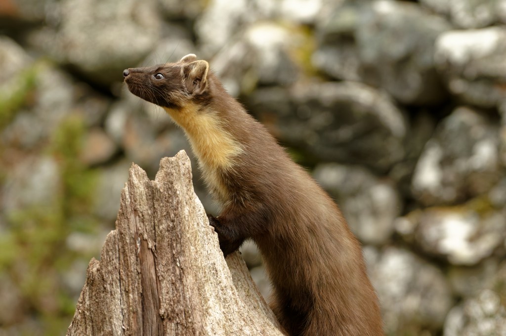 “The pine marten was once widespread and common across Britain but is now rare and recovering. Pine martens are generalist omnivores, eating a wide range of different food species. They predominantly prey on small mammals such as field voles, and this usually consists of up to 50% of their diet. Their diet preference is determined by what is locally most abundant. Predators are a crucial part of a functioning ecosystem. A diverse predator community is expected to naturally limit populations of abundant prey populations. However, pine martens by themselves generally live at low density; a population of one per km2 is considered a high density, and a pair of martens generally need at least 200 ha of suitable woodland.”