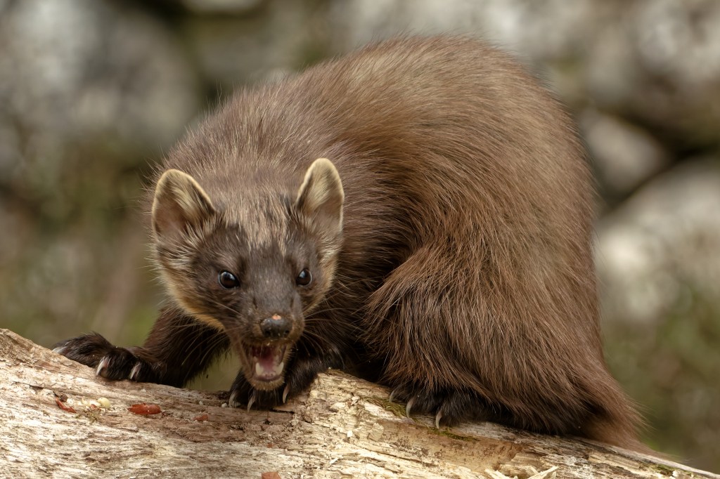 The animal looked quite relaxed – the camera was clicking away all the time but the Marten neither flinched at the sound, nor looked towards it. The teeth were bared from time to time but it looked more like a reflex associated with chewing or swallowing than a threat.