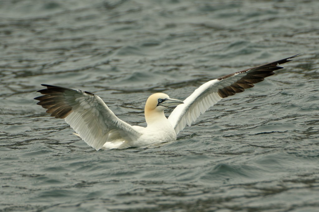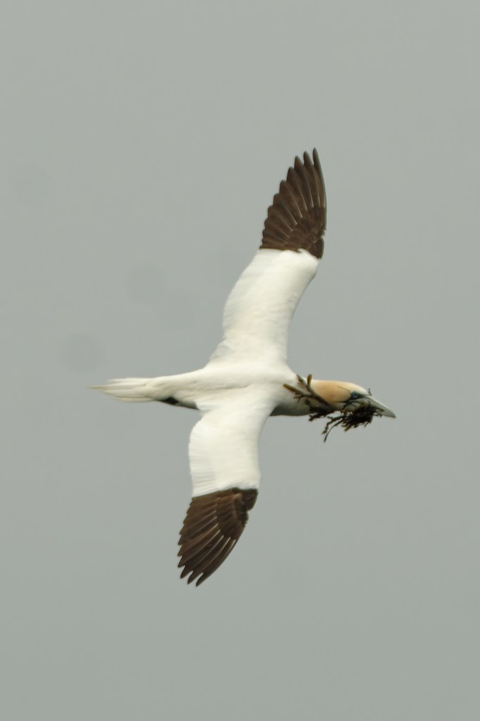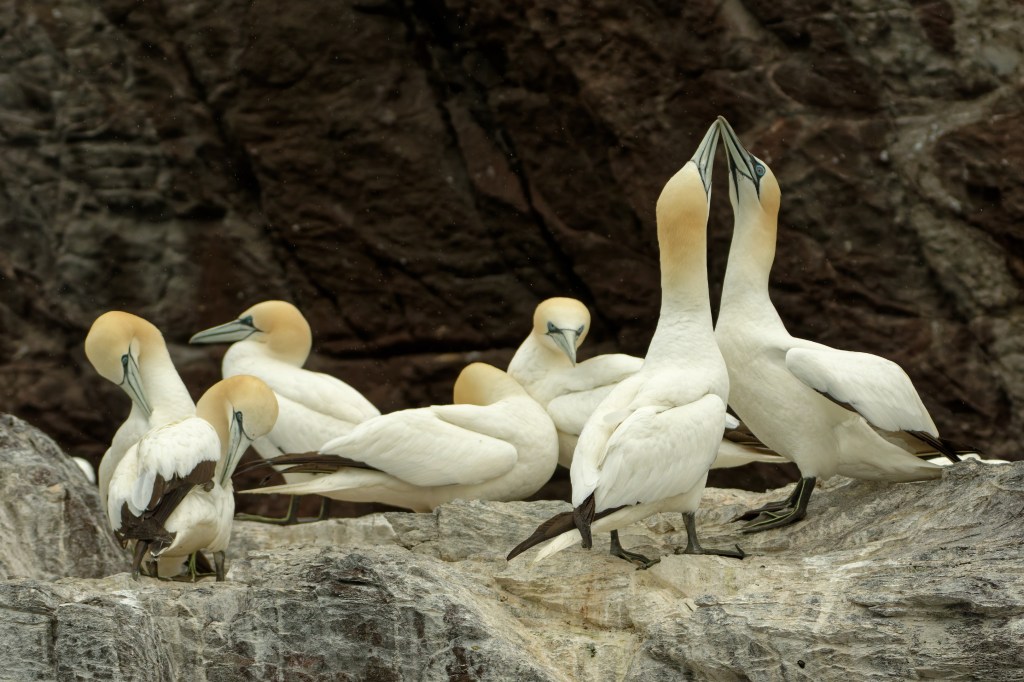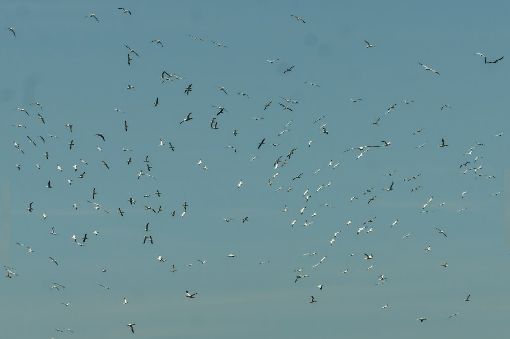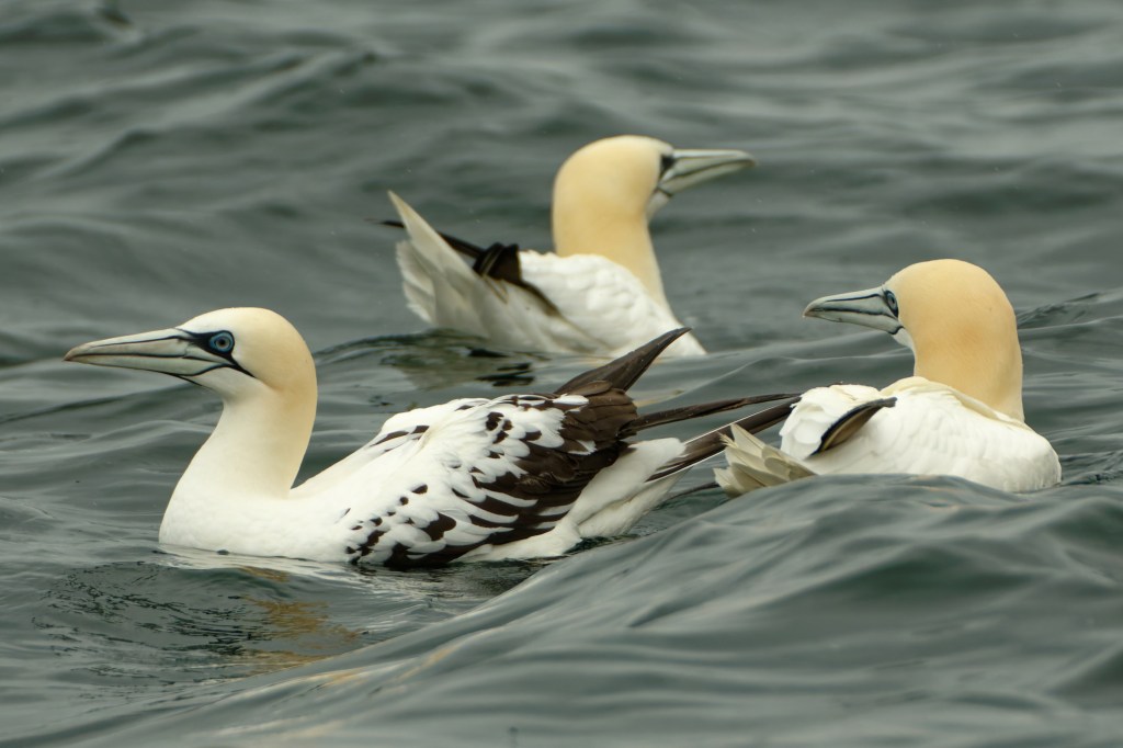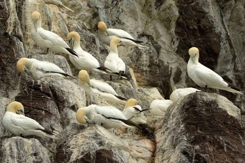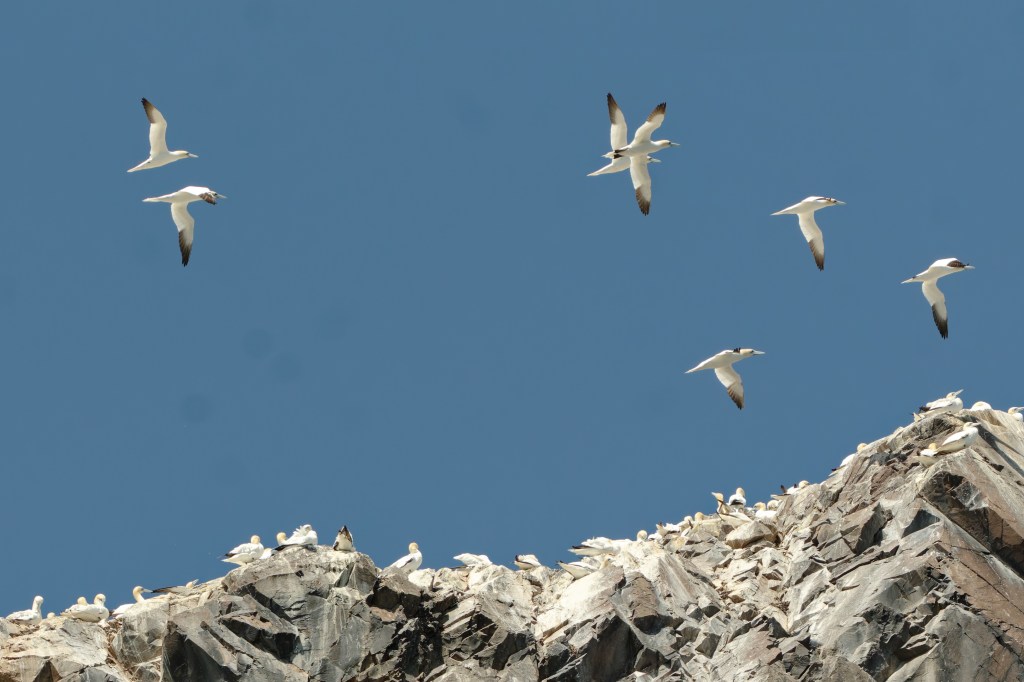 You’ll notice birds with quite a lot of black feathers; these are sub-adult birds. Gannets attain their adult plumage after four to five years.
