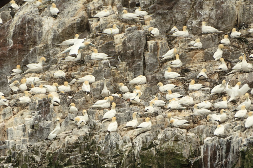 As we approached the Bass, we saw a sky full of Gannets. They were not fishing, but soaring on stiff wings and glittering in the bright sunlight. In Sightlines, Kathleen Jamie describes a visit to a Gannetry beautifully. Indeed Gannets grace the cover of her book. She writes, of her approach to the colony: “It was exciting, like a fun fair; the closer we got to the cliff edge the more we could hear the racket, the more the breeze brought us the smell.”