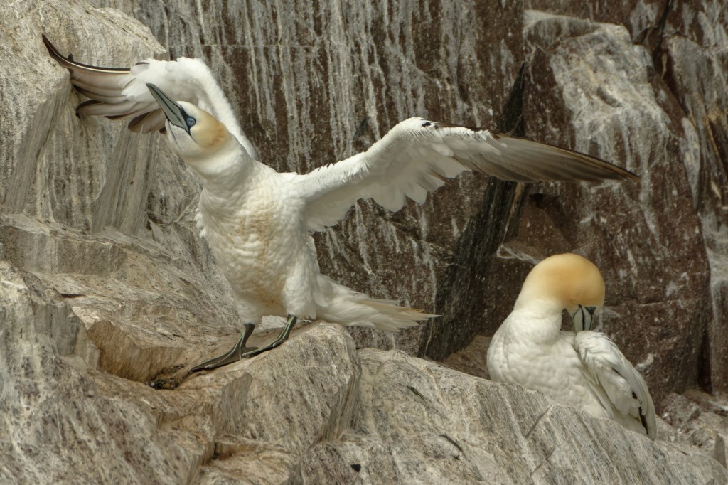 A pair of Gannets will attempt to raise a single chick – some were visible when we visited on the bright day. As it grows, this bird will take on the dark plumage of the juvenile.