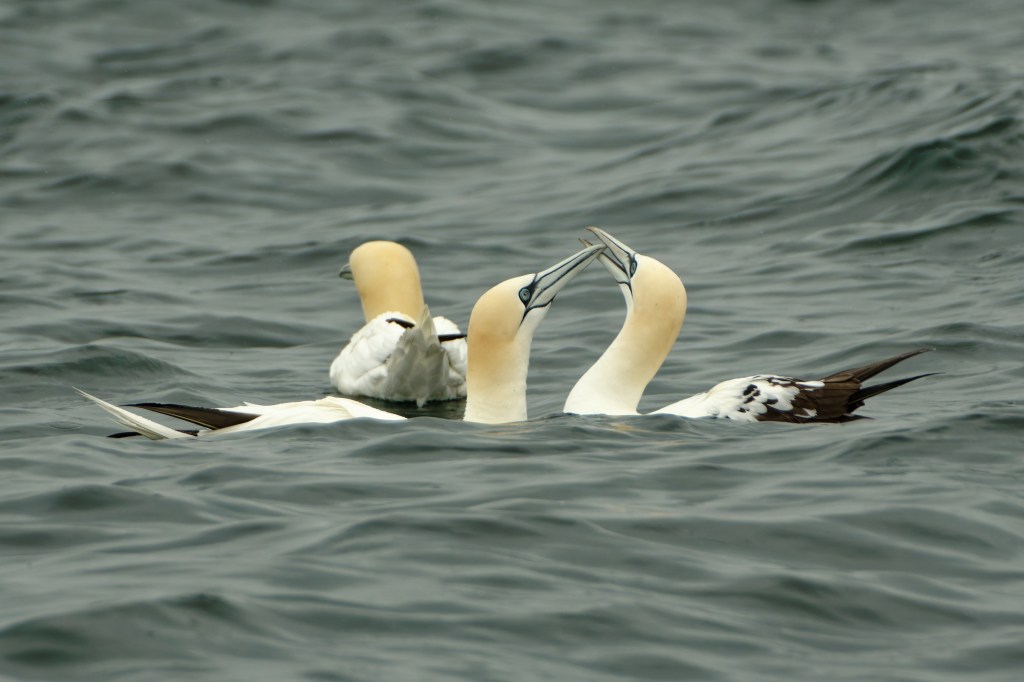The Gannets are bonding in the top photograph; this seems to be only part of their ritual life, described in this review.
