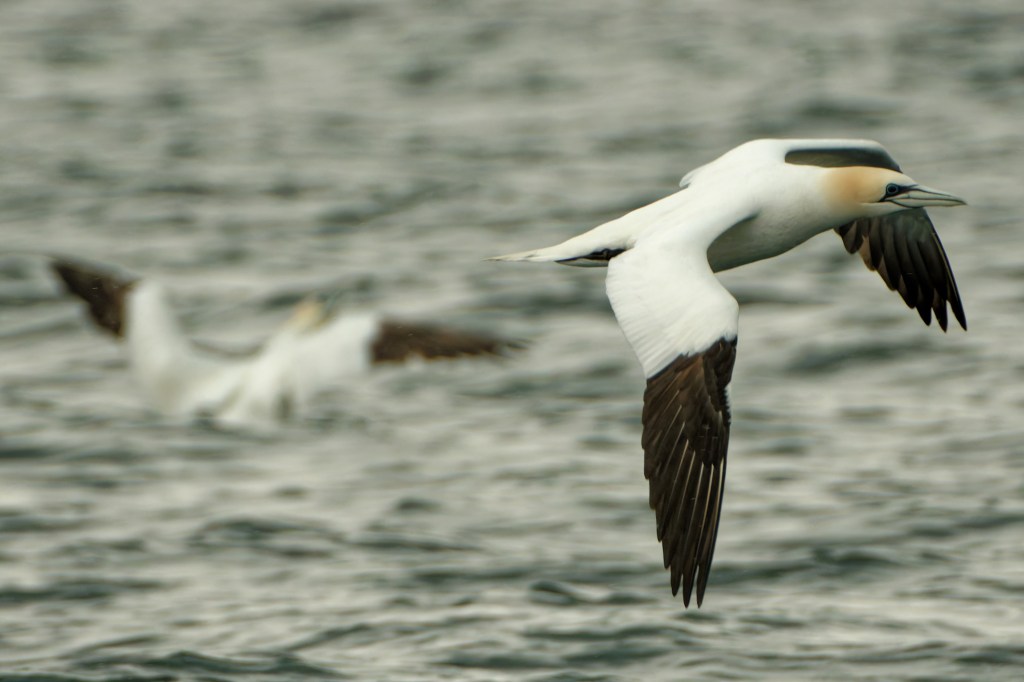 Quite a lot is known about Gannet migration: “The Gannet Morus bassanus is one of the seabirds considered most at risk from collision mortality at offshore wind farms in UK waters, so a better understanding of migration routes informs assessments of risk for different populations. Deployment of geolocators on breeding adults at the Bass Rock, Scotland, and Skrúður, Iceland, showed that the timing of migrations differed between populations, birds from Bass Rock passing south through UK waters mostly in October and back in February while birds from Skrúður passed south through UK waters mostly later, in November, but returned north earlier, in January. Many birds from both colonies made a clockwise loop migration around Britain and Ireland. Only a minority of birds from the Bass Rock returned northwards to the colony through the southern North Sea. A counter-intuitive consequence is that many Gannets moving northwards through waters to the west of Britain and Ireland in spring may be birds from North Sea colonies. Although Gannets normally remain over the sea, one tracked bird appears to have made a short overland passage in spring from the west of Scotland through central Scotland to the Bass Rock, whereas most returned around the north of Scotland.”
