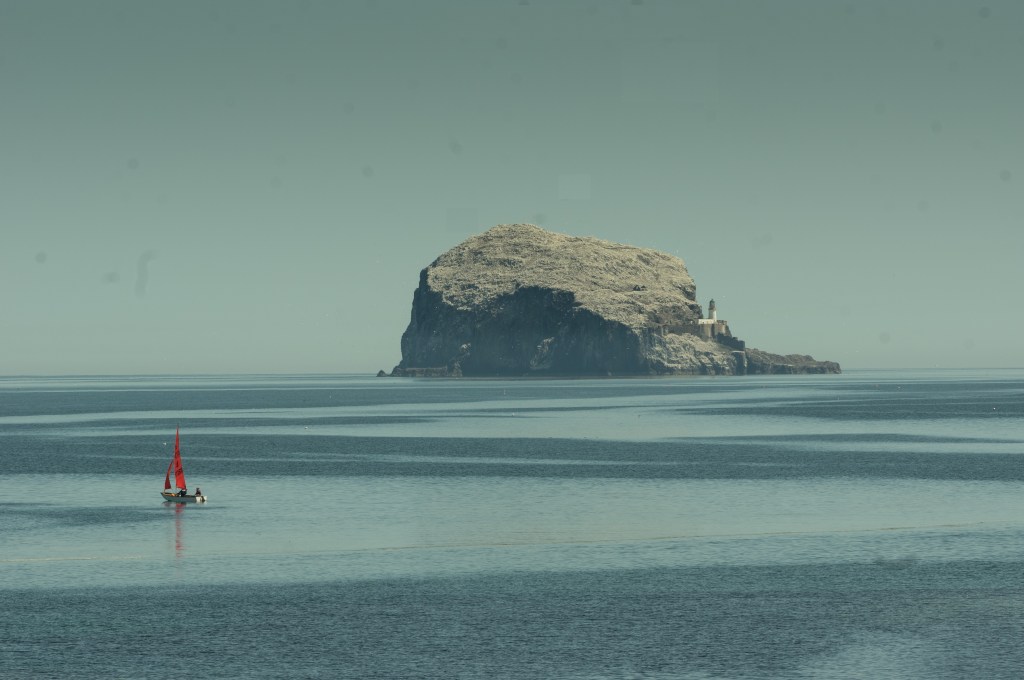 Backwoodsman has made not one but two visits to Bass Rock, “the world’s largest northern gannet colony”, recently. Both visits took place on trips organised through the Scottish Seabird Centre in North Berwick. We’ve been trying to get on one of these boats for a year or two; they are booked up well in advance and Faye made our bookings early in the new year. As the dates approached, we scrutinised weather forecasts, dreading the possibilities of gales and downpours. Neither arose; instead, we had two dry days, one grey and slightly gloomy and one blessed with brilliant light. The view of the rock through the window of the Scottish Seabird Centre on the much brighter day is at the top of the post. If you can scroll up on the image, you will see individual Gannets in the sky and sitting on the rock in the colony.