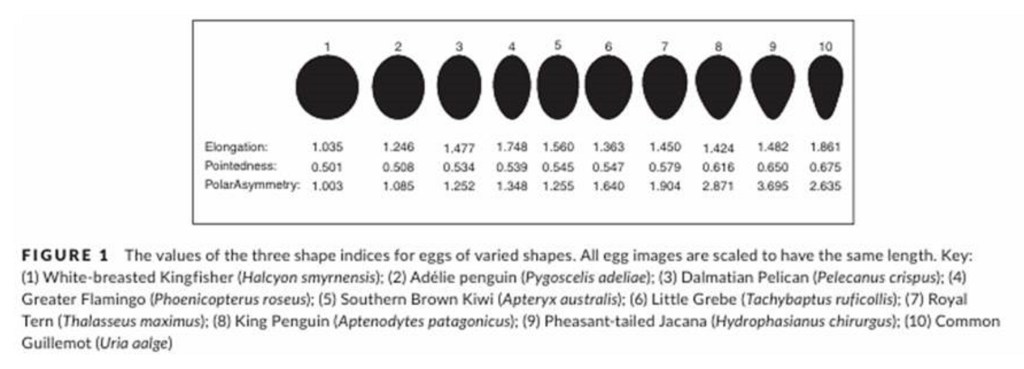 From photographs, he concludes that the majority of incubating birds are oriented with their heads directed upslope; birds incubating their single eggs, have the blunt end of the egg oriented away from the bird and up the slope. This natural resting position of the egg tends to lift the blunt end up and away from the guano which inevitably carpets the densely crowded breeding ledges. There are many fascinating things in the thesis; one of the publications upon which the thesis is based contains this graphic which shows a whole spectrum of egg shapes, with the pyriform egg at one extreme.