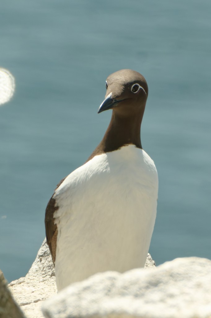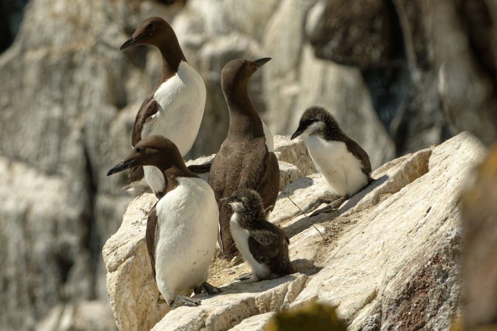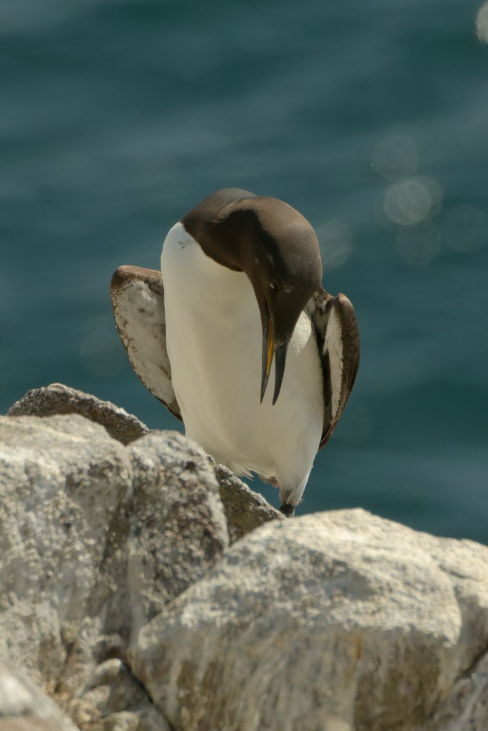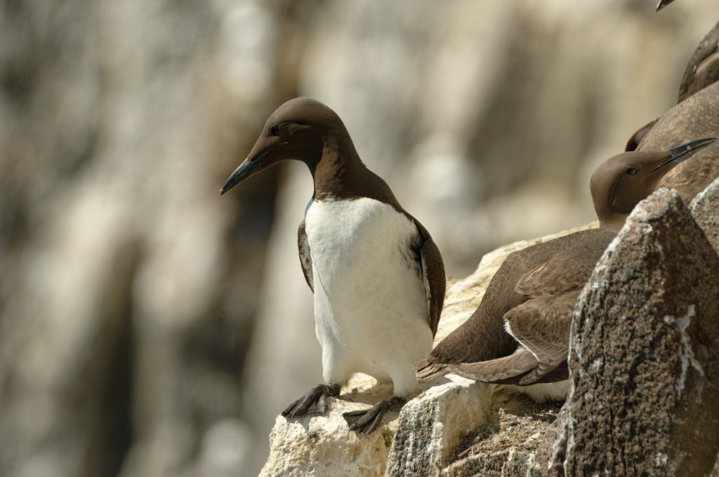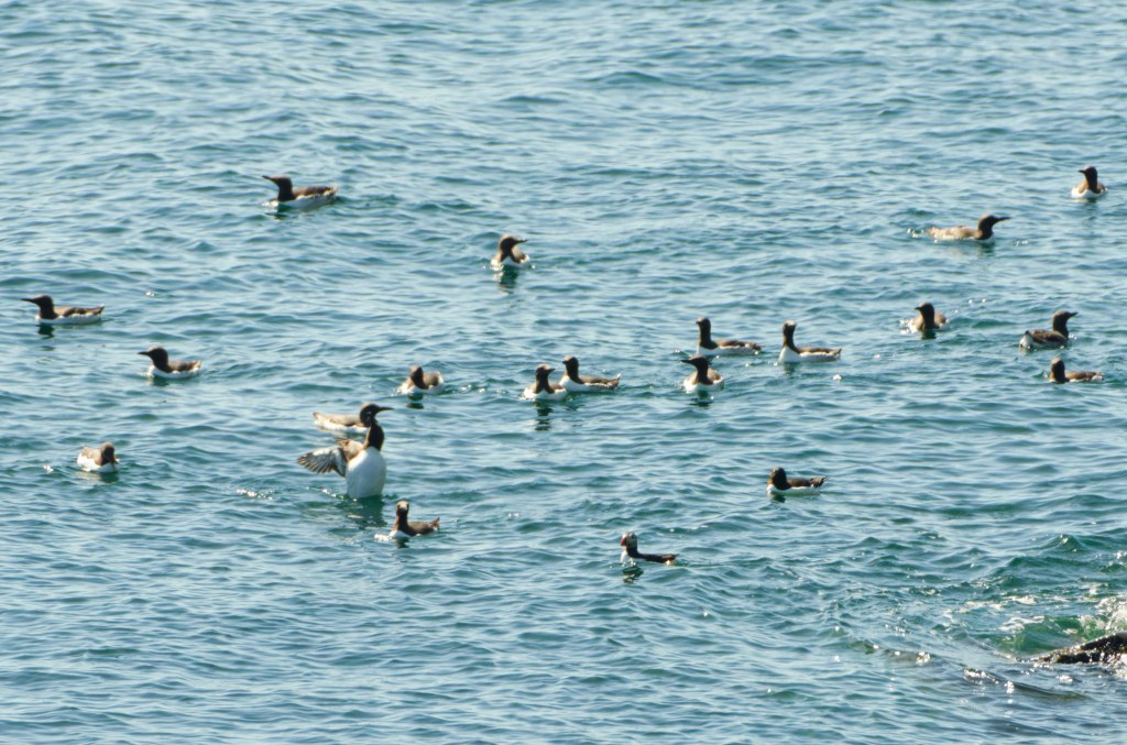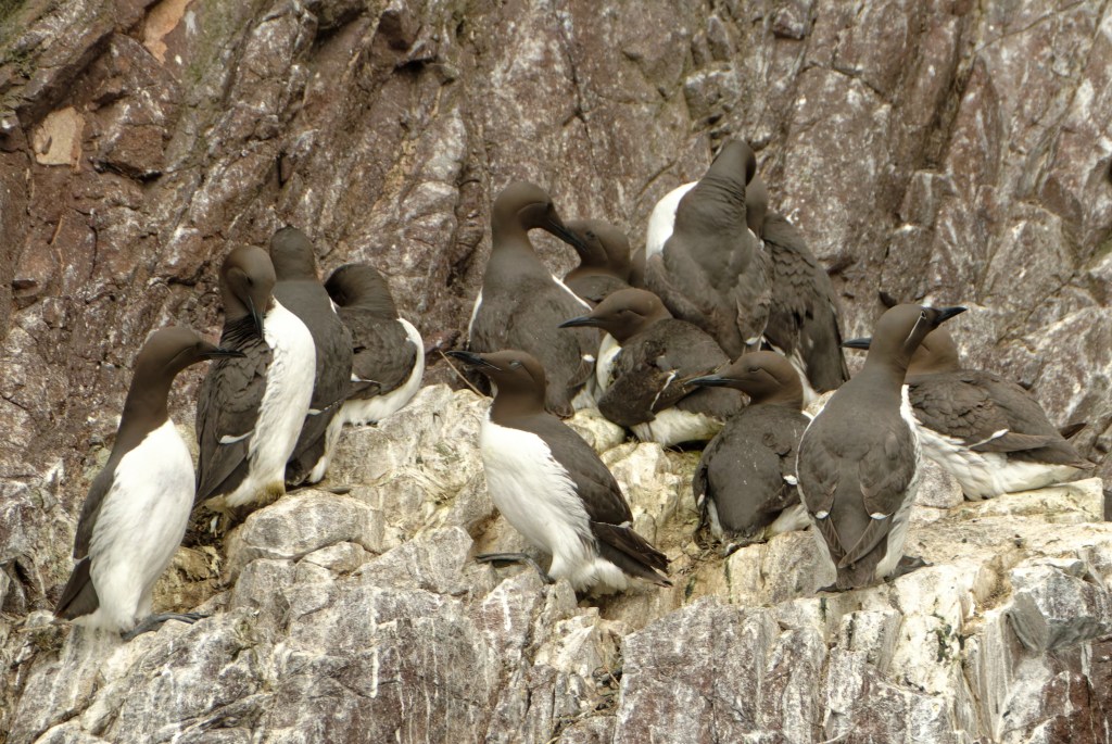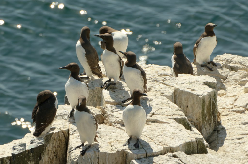 Photographing Guillemots can be a bit frustrating, particularly if they are standing on a ledge and incubating eggs – one each, that is. Most birds will be facing the cliff, bill upturned; this group may contain some birds on eggs, though there are no eggs to be seen.