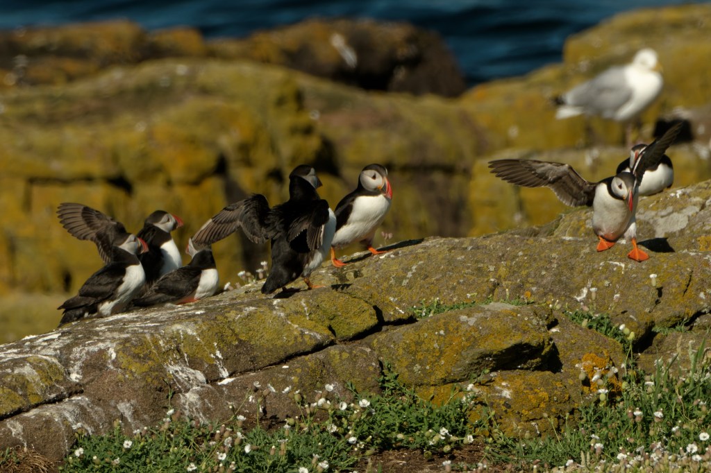 The trip took place on a day of brilliant light and across a flat calm sea. We passed by Bass Rock on the way, so it took a while to reach the Isle. Once we arrived at the Isle, we were free to wander, though the importance of staying to the clear paths was stressed by the warden from our boat. And with good reason – almost every part of the grassland seemed to contain a Puffin burrow. Puffins were everywhere, sitting in small groups, or setting off to fish.