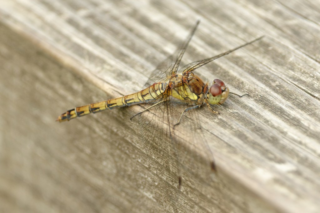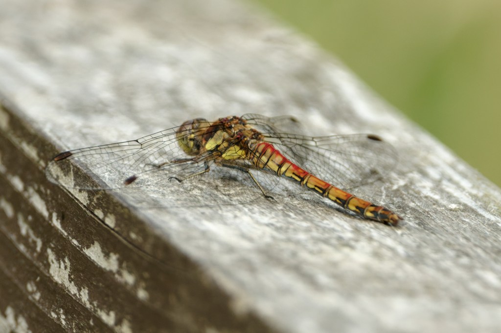 The superb light allowed quite a fast shutter speed to be used, which was important as the photographer was being blown about and the camera was doing its best to swing around on the monopod. The dragonfly was vibrating in the wind but between gusts, some decent images could be had. Backwoodsman is standing away and using full zoom to get a decent dataset without looming and disturbing the insect. The resolution of small parts of the insect like the bristles on the legs and the tufts behind the head is really quite pleasing. And don’t the colours sing?