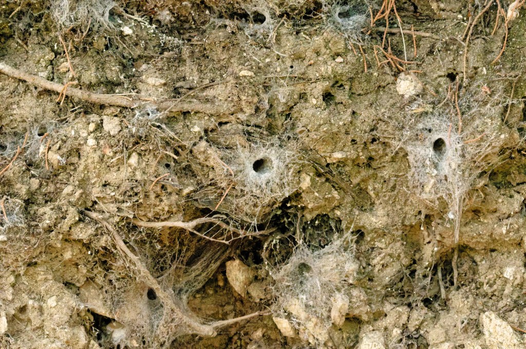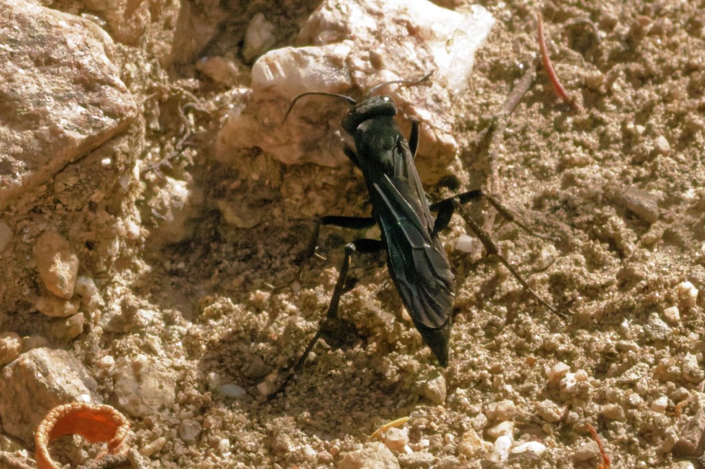 We also noted many silk-lined tunnels in the area where we found the wasp – it looks like the odd spider might be around for the wasps to munch.