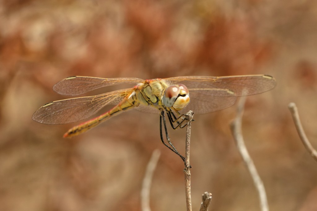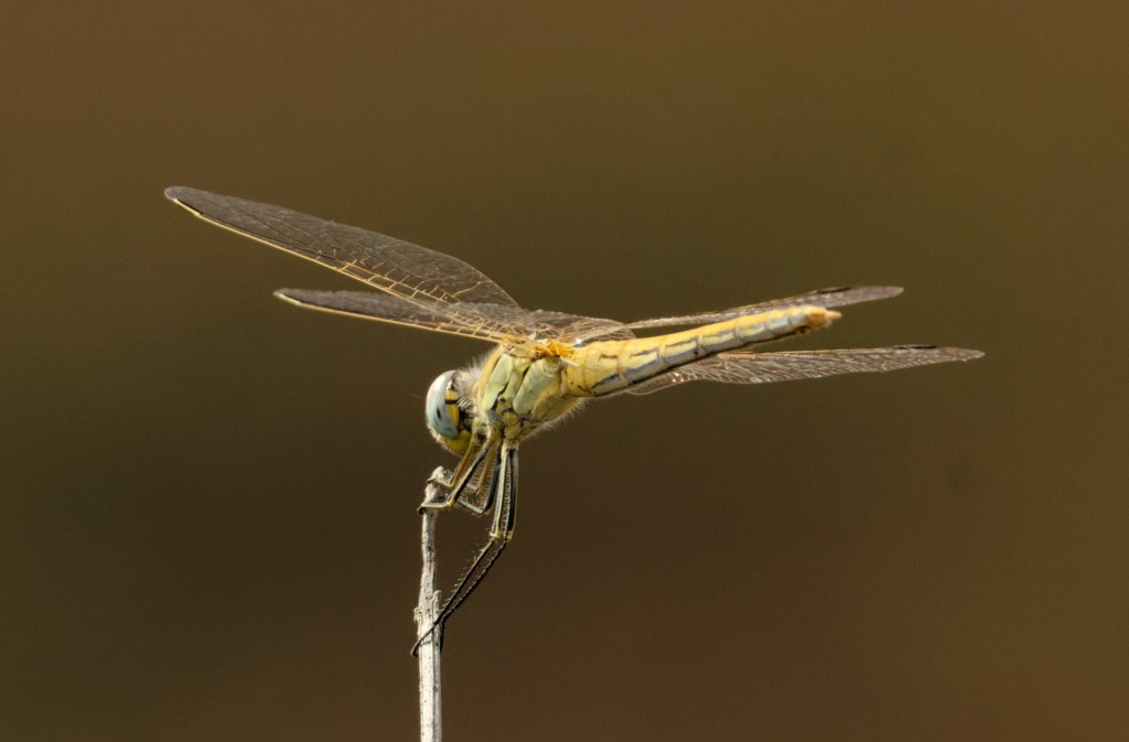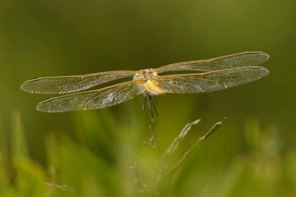 The insects had favoured perching posts which they returned to frequently, and from one day to another. This female perched nicely, showing the yellow wing veins really clearly.