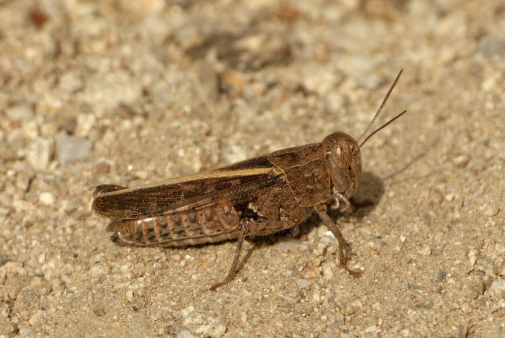 Picture Insect says this is Oedipoda caerulescens, the Blue-winged grasshopper. We did not manage to see the rather striking underwings clearly, but a flash of this delicate colour in strong light would explain the sudden brightness as the insects took to the wing.