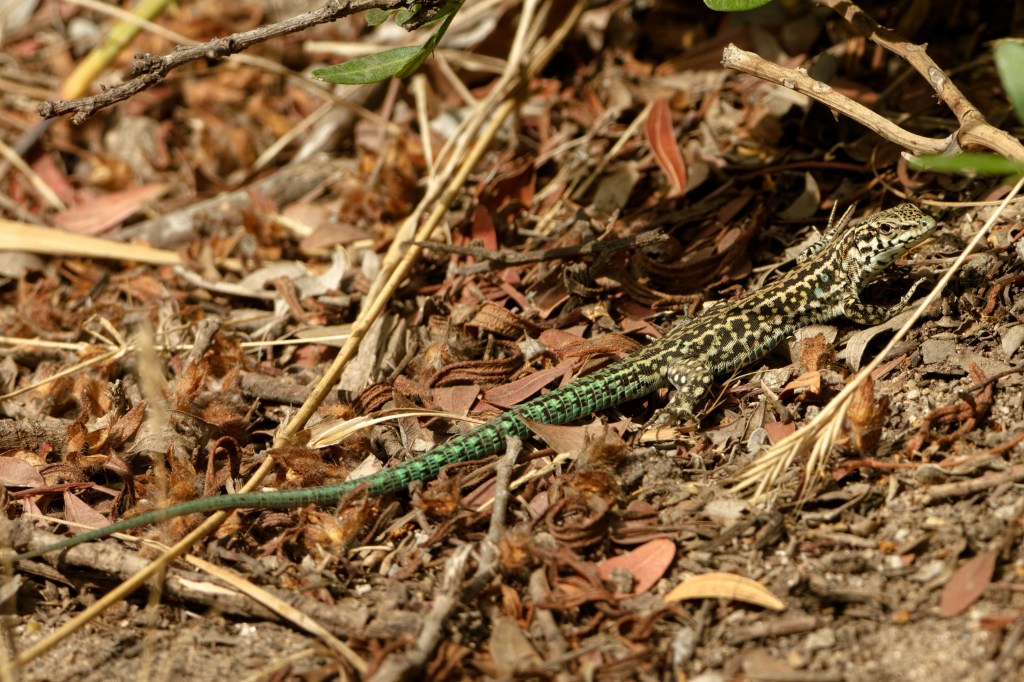 No doubt about this chap though – a Tyrrhenian wall lizard, handsome with his malachite-green tail.