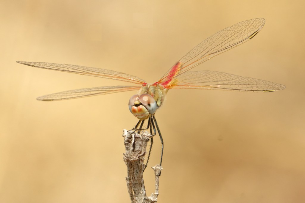 The Red-veined Darter can be distinguished by the blue eyes, pale pterostigma (wing spots) outlined in black, and the coloured wing veins (red in males, yellow in females).