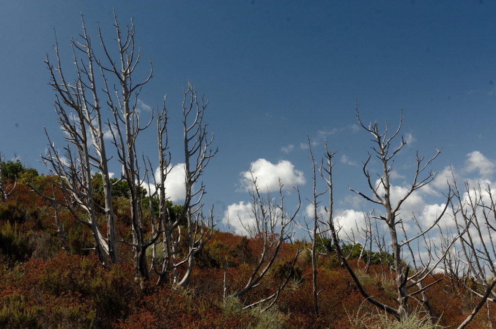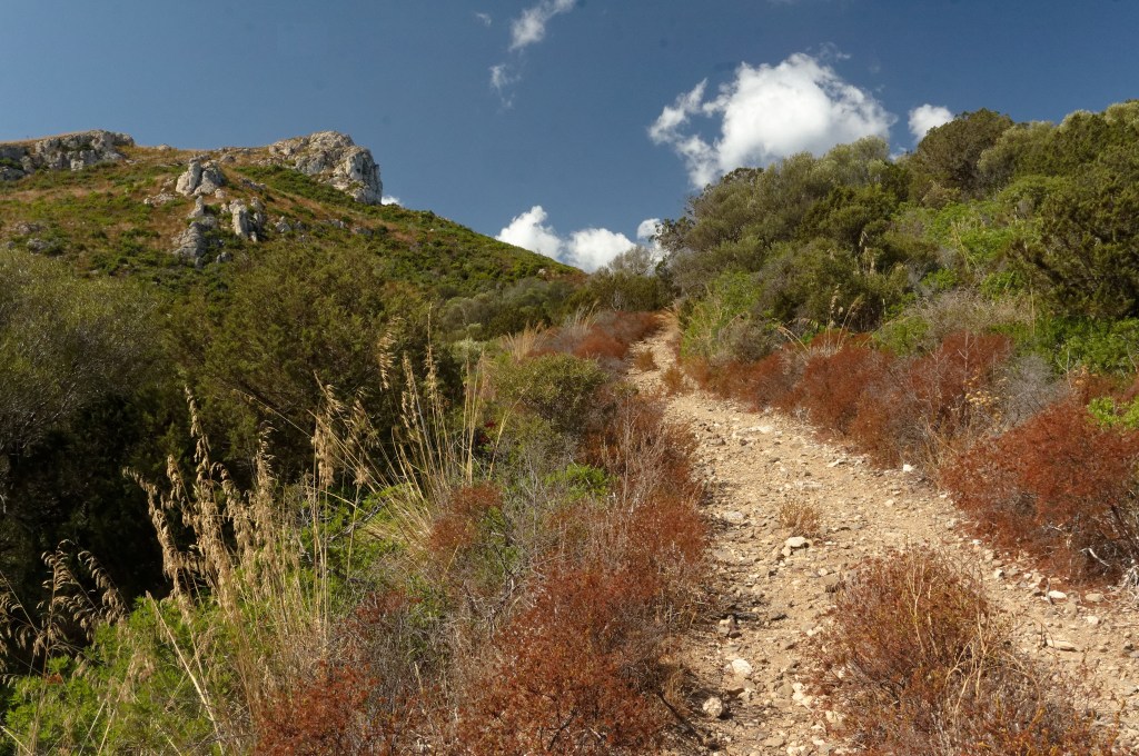 The landscape had a burnt look; under still conditions, even short walks would have proved difficult, but we had the benefit of a very strong breeze on several days. On such days, we could explore the Capo Figari, a headland made principally of Limestone (much of Sardinia is Granite). Several walking trails were available, including one (Sentiero dei Carbonai) which took us up towards the outcrop of Rocca Ruja (just left of centre in the image).