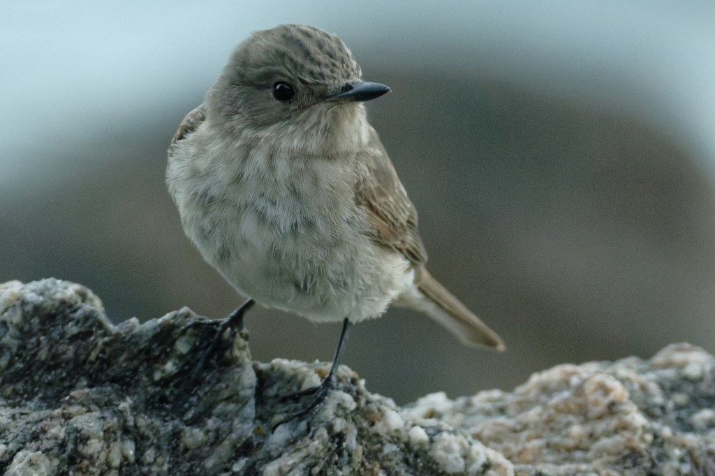 Our bird seemed to have a territory bounded at one end by a thicket beside the hotel pool, and at the other by some rocks on the beach near the lifeguard’s chair and ladder. During the middle of the day, the bird could be heard moving about in the thicket; at the hour of the aperitivo, the bird would emerge and perch on the terrace rail, making very short flights to seize insects. But in the early morning when we visited the sea before breakfast, there were two birds, standing on the rocks for extended periods. Backwoodsman’s only real shots at anything with feathers! We were all in the shade, alas, but the image quality is not too bad.
