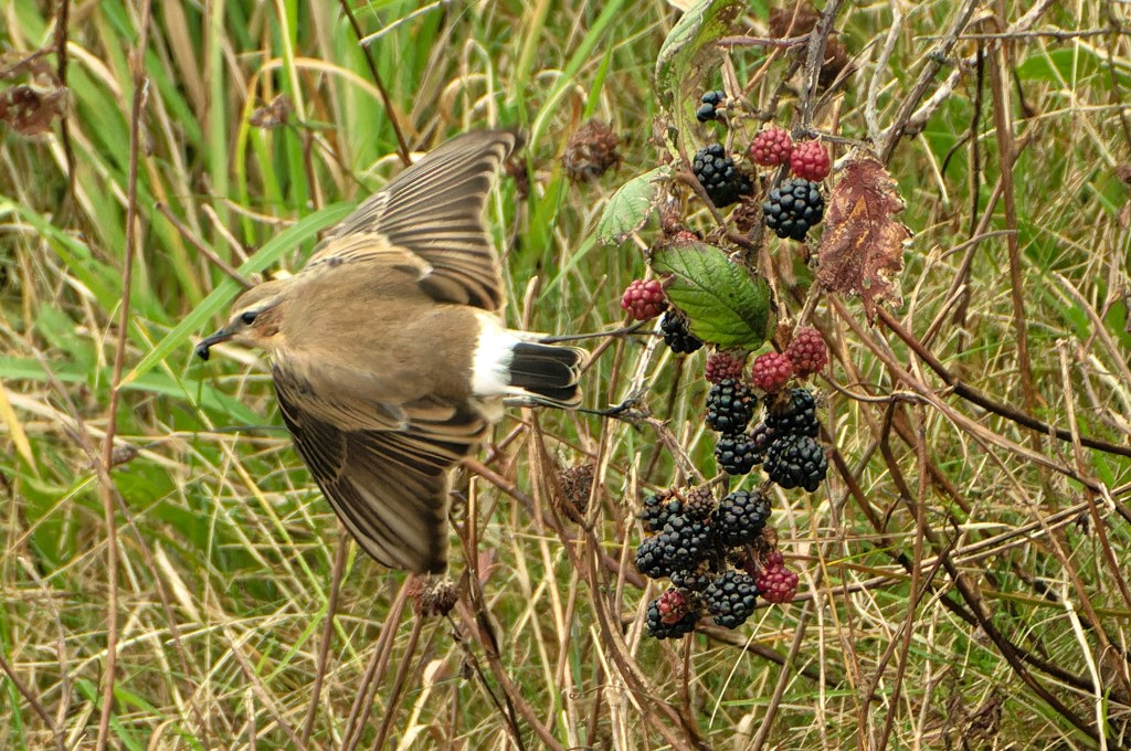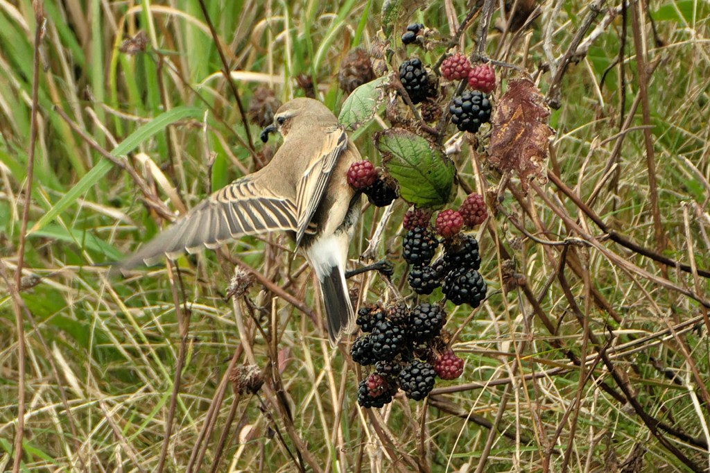 Backwoodsman looked back through the archives for other possible Wheatears and arrived at a folder of images taken at Cardross on September 21st in 2024. An adult bird, definitely a female, was feeding in the brambles.