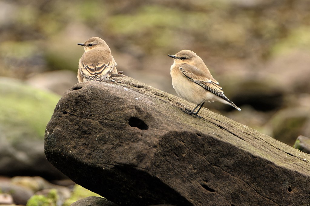 We might have struggled with these birds – they could be juvenile or female Stonechats, or Whinchats. Their posture makes them look quite rotund, whereas one of the key descriptors of the Wheatear is “sleek”. The adult plumage is clearly developing; there is a strong hint of the eye stripe and the white rump is clear to see.