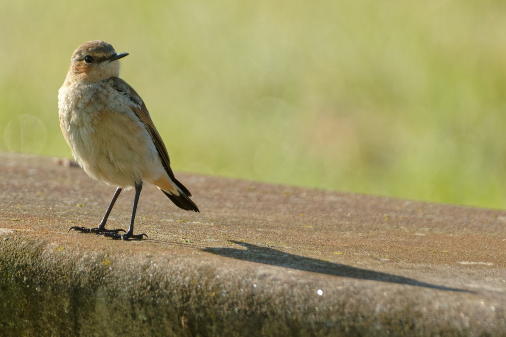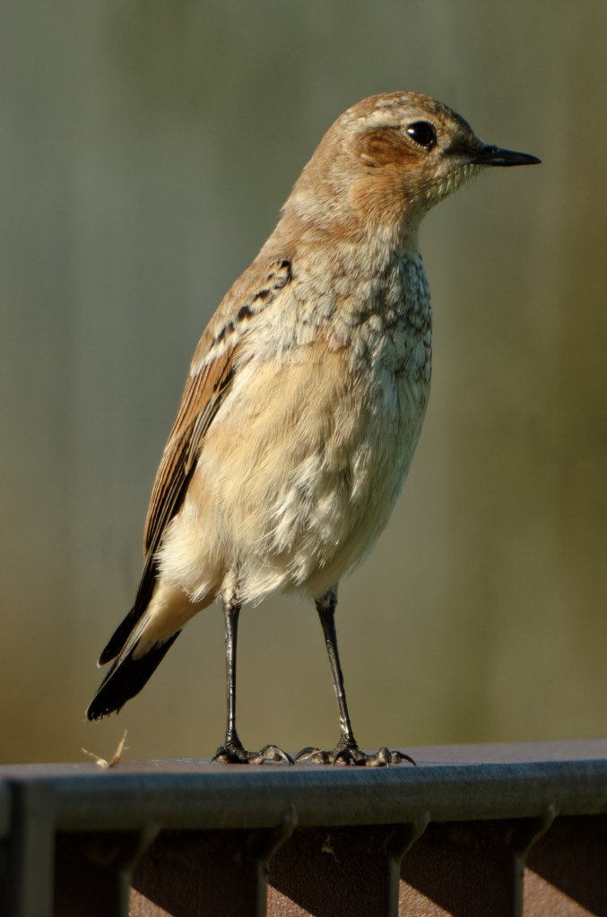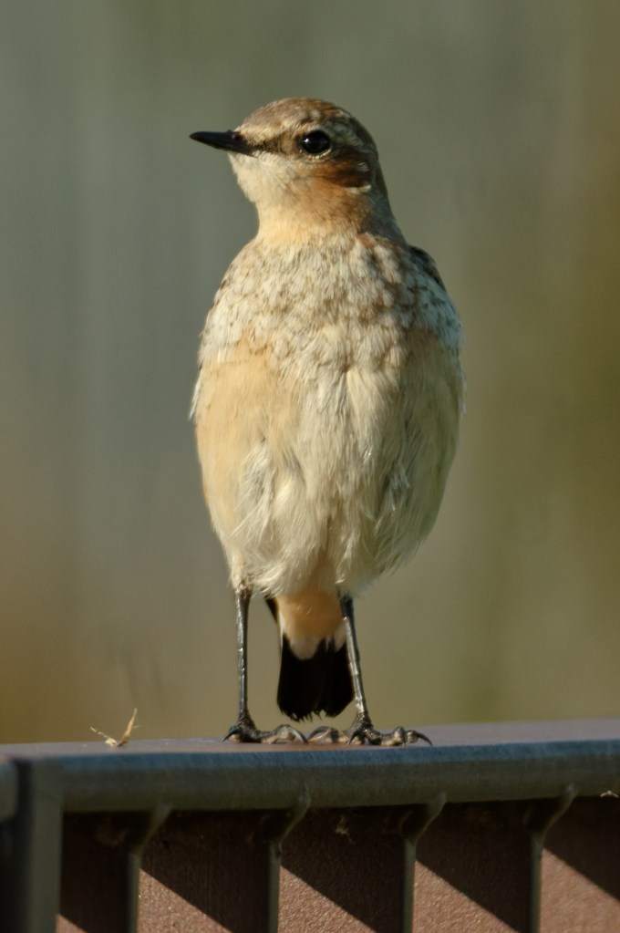 We caught a flash of a white rump as it flew to the rail – Wheatear, we thought. The posture looked right, and the perching habit. We sat down for a cup of tea and watched. There were plenty of places (concrete benches, guard rails, waste bins) for the bird to perch on, and it took full advantage, moving around us and trying out the possibilities. It was happy to let Backwoodsman approach it with the camera, suggesting that it was a young bird. Adult Wheatears usually flee from the approaching photographer or walker.