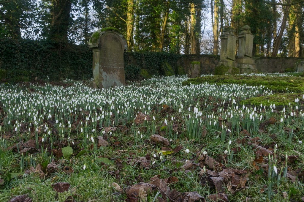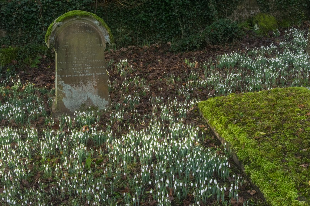 We returned last Sunday, full of anticipation. I had seen Snowdrops coming through in my mother’s garden while I was shifting the autumn leaves, and we had both seen them on the banks of the Kelvin, so we were confident that Cadder would have a good show ready for us. We weren’t disappointed, and I set to work to try and take some nice photographs while the church was readied for the service at half-past ten. I made a recording of a Robin singing, backed by some distant Jackdaws, and the church pianist playing the hymn tune Laudate dominum by C. H. H. Parry.
