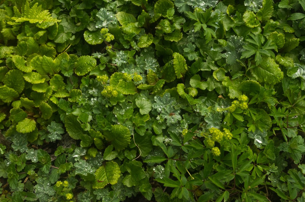 I like this “interplanting” of Alchemilla mollis and (an unknown) Primula – I’m told that the former plant “is valued for the appearance of its leaves in wet weather. Water beads on the leaves due to their dewetting (the process of retraction of a fluid from a non-wettable surface it was forced to cover) properties. These beads of water were considered by alchemists to be the purest form of water. They used this water in their quest to turn base metal into gold, hence the name Alchemilla. The Latin specific epithet mollis means “soft”, referring to the hairs on the leaves.” Imagine being the alchemist’s lab assistant and collecting those beads of water by the litre.