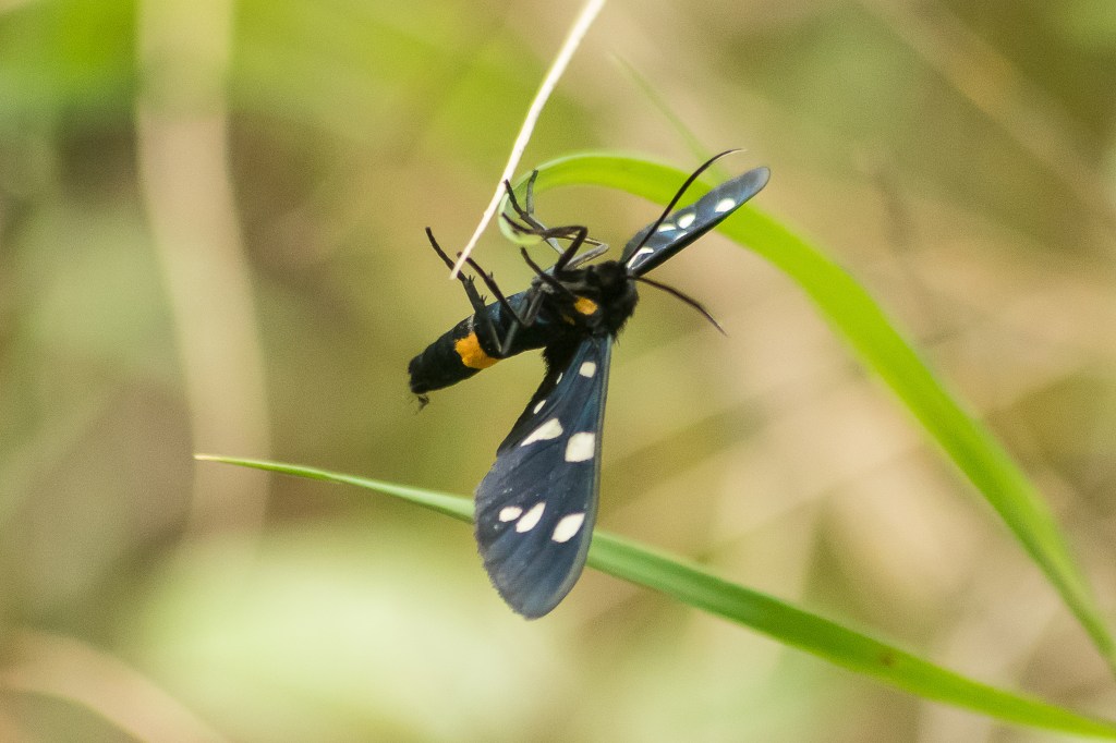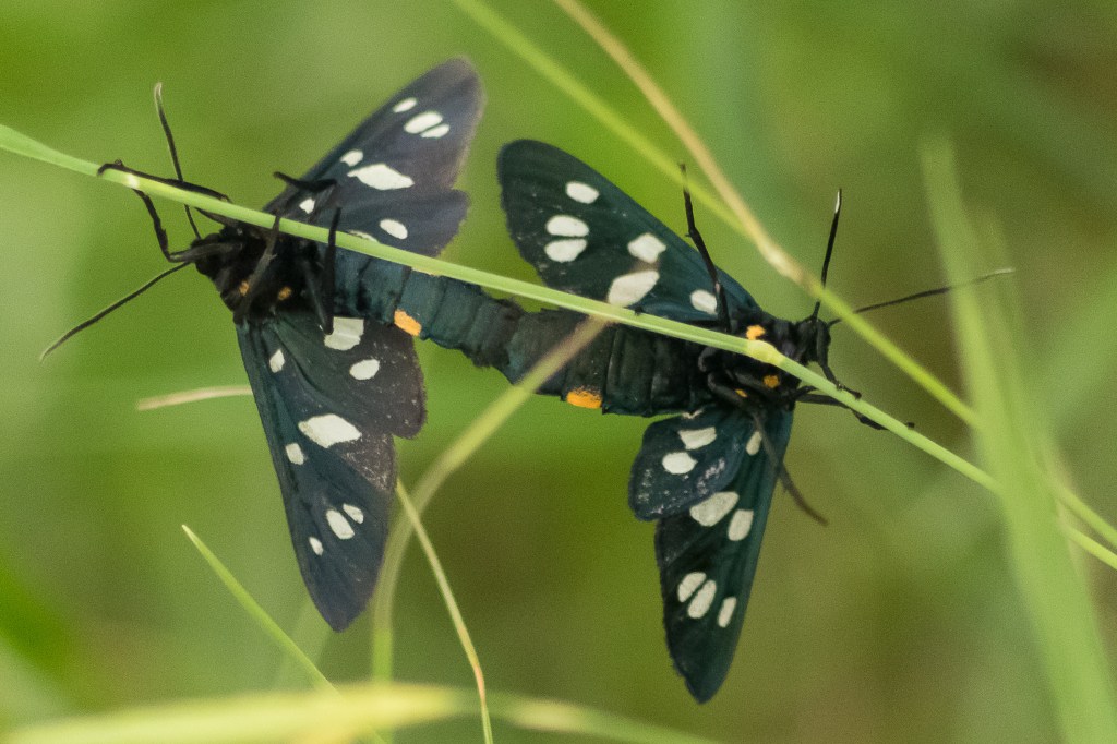 The Nine-spotted moth or Yellow-belted burnet (Amata phegea) was on the wing and mating. Zygaena ephialtes is a similar looking species, though with fewer spots. My moths seem to have eight white spots, matching the count from the images of the Nine-spotteds in the literature. If you follow the links, you’ll find some interesting material about different types of mimicry in insects.