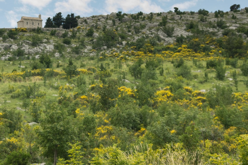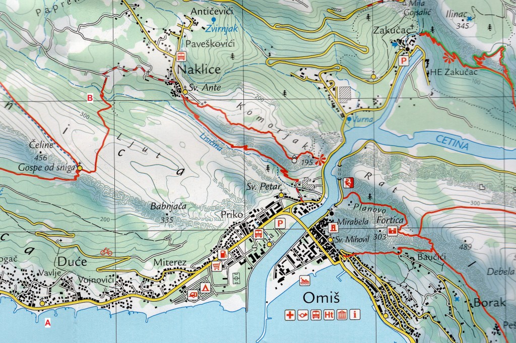 We stayed on the beach, just about where the A is by Vavlje (the map is standard Landranger scale, one square is one Km); our first walk took us East and then North east along the yellow road heading for the town past the slightly grim Camp Galeb in Miterez (Ms Braverman would fill it with migrants given half a chance). Around Sv. Petar, a laid stone path (just like an old drovers’ road) climbs the Lisicina Gorge up to Naklice. From there, a track, then a narrow path heads West, then drops South into a wooded valley, fording the Lisicina before climbing back up the limestone to the little chapel at Gospe od Sniga.