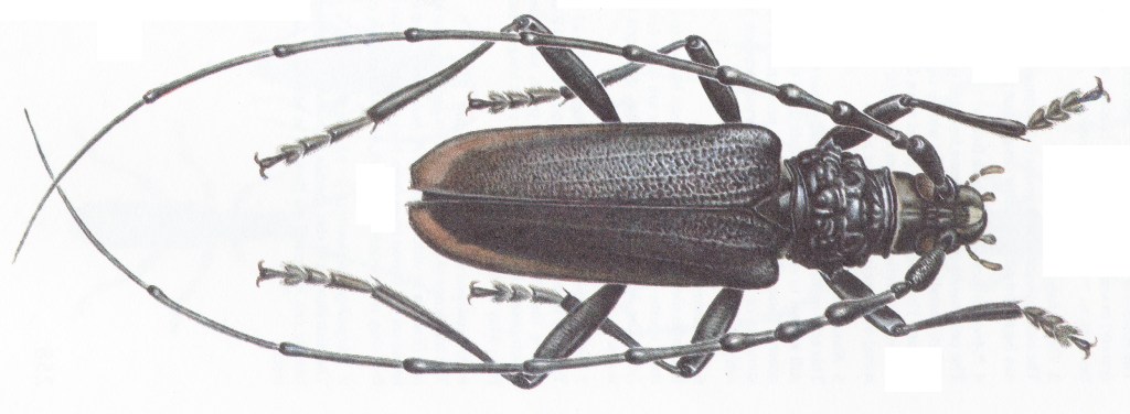 He’d only gone a few metres and was now swaying on a stem, all 5cm or so of him (antennae excluded). My beetle book identifies him as Cerambyx cerdo, The Capricorn beetle. I’ve included the beautiful graphic by František Severa, a prolific book illustrator about whom I can find absolutely nothing. The photographic image is of sufficiently high quality to reveal the illustrator’s powers of observation and technique.
