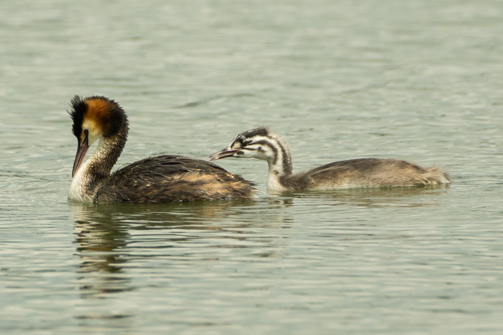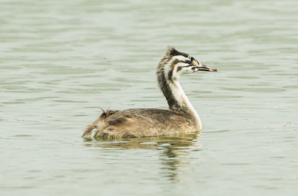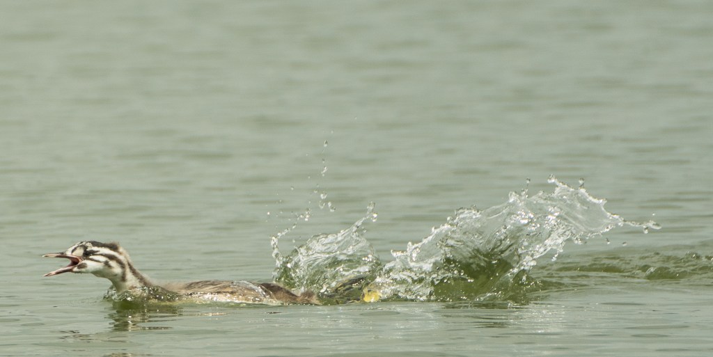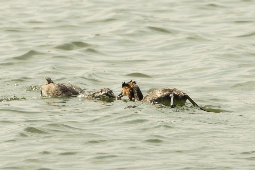 The motion of the chicks across the surface was interesting – adult birds usually dive to escape intrusion and I’ve never seen one moving in this way but I’m sure they could. Their legs are set a long way back on the body which makes their movements out of the water very awkward but it is probably excellent for propulsion through the water.