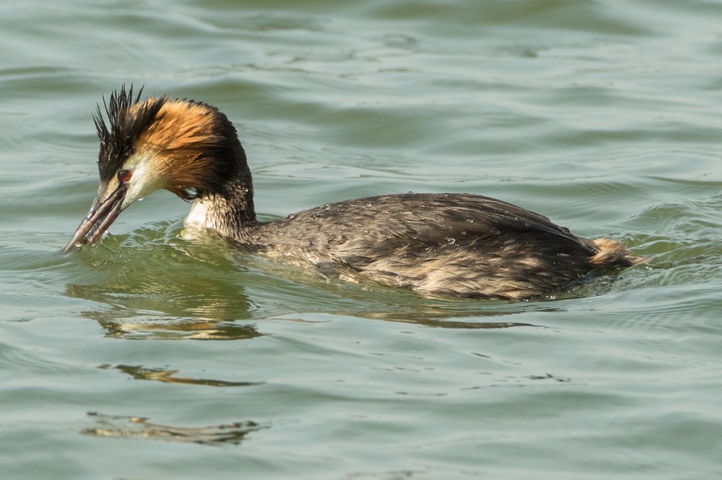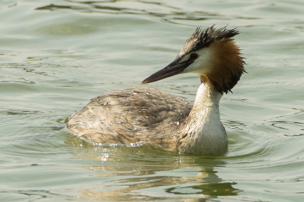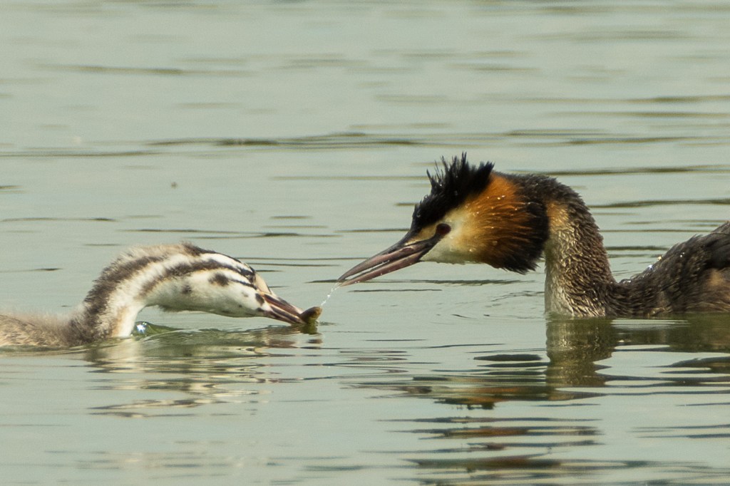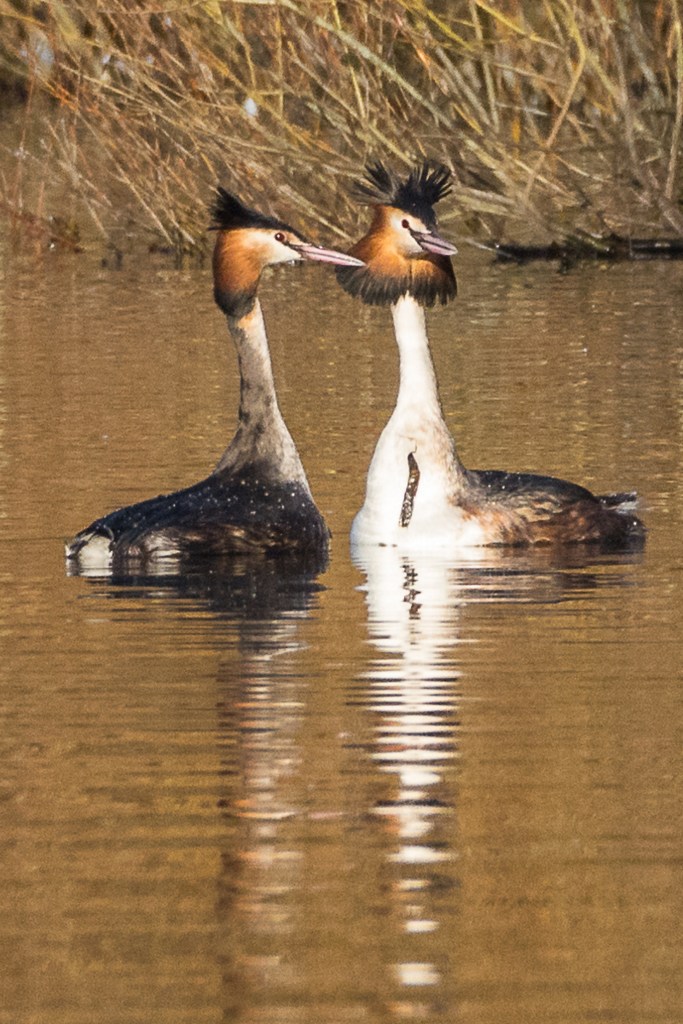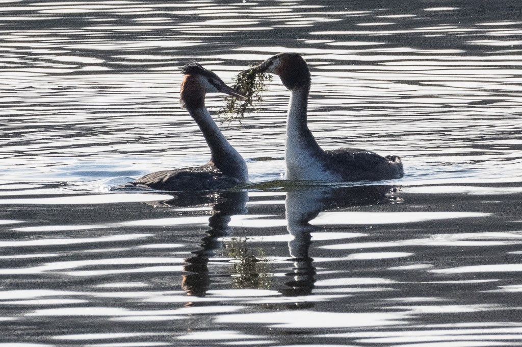 They were some distance away so the image is grainy but you can see that one of the birds has the head feathers and ruff raised in display. Julian Huxley spent two weeks watching Great Crested Grebes on a reservoir near Tring in Hertfordshire; he wrote an influential paper on their behaviour and presented it to the Zoological Society of London in 1914. He noted that the Grebes had an extensive repertoire of moves, and that these continued long after pairing – it follows that courtship is not the best description for this behaviour. Huxley used his observations to modify Darwin’s ideas about sexual selection. A retrospective in Nature discussed how Huxley’s ideas have stimulated subsequent work in the field.