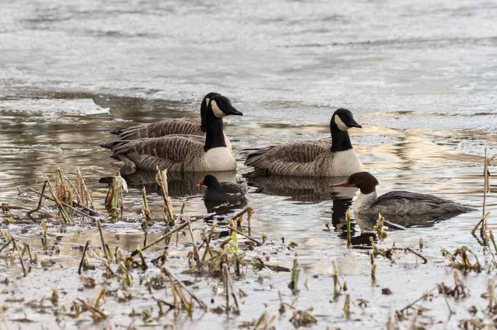 In urban settings, Canada Geese can grow bold. At the University of Birmingham Vale Hall of Residence site, the students who lived in the Wyddrington Hall would “revise” for their summer examinations around the lake which lay at the centre of the site, my wife-to-be among them. However, their studies would often be interrupted by the Canada Geese which had taken the site for their own and become quite aggressive on their territories. At Hogganfield Loch, the Canadas allow relatively close approach, in the winter at least. I like this useful scaling image with the tiny moorhen, the larger Goosander and the seriously chunky goose. At close approach, the textures of individual feathers are revealed.