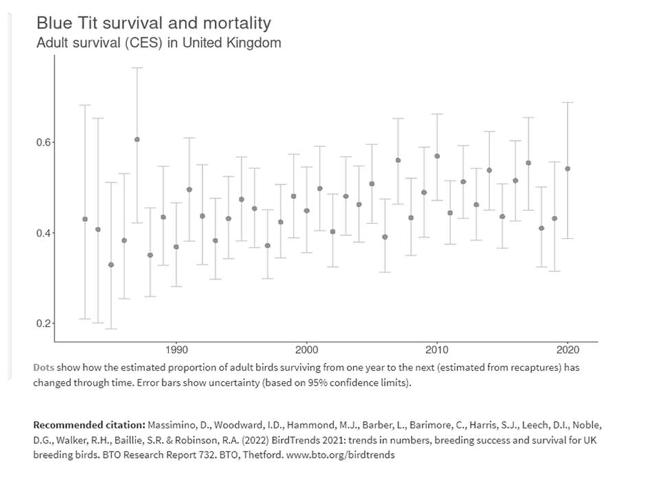 A typical Blue Tit lifespan is three years and they breed at one year old; this plot was constructed by the BTO from ringed bird recovery data and indicates a roughly fifty-fifty chance of a Blue Tit making it from one year to the next. Backwoodsman does not get statistics (having failed it at university) and would probably treat this set of points by putting a trendline through them, indicating that perhaps Blue Tits were revelling in a slightly higher chance of survival with each passing year.