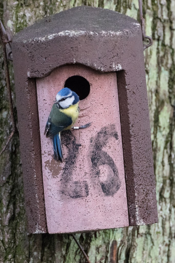 The RSPB services and monitors a considerable number of nest boxes in the Kelvingrove Park and Blue Tits are adept at using them – this individual was prospecting in January.