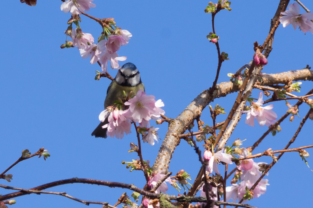 Recent activity on the cage feeder in our window has prompted this post, but alas, the feeder is not in a position which allows good photographs to be taken of the eight Blue Tits which regularly mob it and strip it of its payload of RSPB Super Suet Bars. However, we do have a Birch sapling close to one of our windows, and it is a favoured perch for Blue Tits throughout the year, unsurprisingly, as it between our two feeding stations. In addition to the Super Suet Bars (saturated fat, peanut flower, ground mealworms), they have access to Sunflower hearts (polyunsaturated fat, Vitamin E or α-tocopherol) at the second station. The Tits snatch one or two seeds from under the noses of the goldfinch posse, and take them back to the Birch, where they pin a seed beneath a foot and eat.
