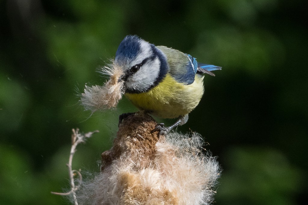 In natural settings, Blue Tits nest in tree holes and lay an average of of eight to ten eggs once, sometimes twice, a year. There are around three million territories in the UK. Around here, any sort of crevice seems to be considered as a potential nest site. I imagine they are very broad-minded when it comes to nesting material – this pair look like they were gathering down for a lining.
