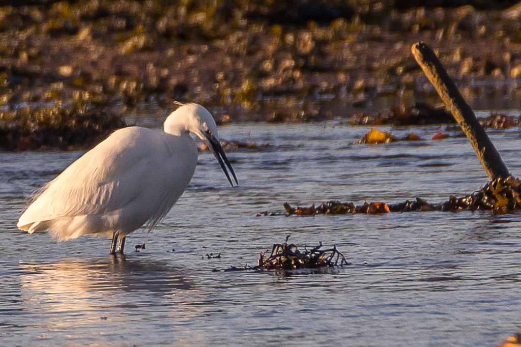 Backwoodsman’s first sight of a Little Egret was at Cardross in front of the sawmill. Before the acquisition of the best zoom lens, Backwoodsman would travel with the just the birdscope and no camera. There across the mud was a tallish and poised white bird; through the scope, it was clearly a Little Egret. It was dithering its leading foot in a tide pool to disturb prey, probably crustaceans or small fish. It was a surprising sight to Backwoodsman, but not to a passing member of the RSPB Helensburgh group who was quite blasé about it. According to the British Trust for Ornithology: