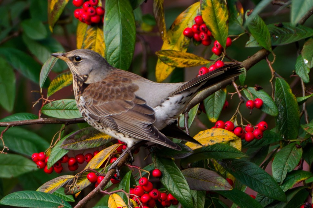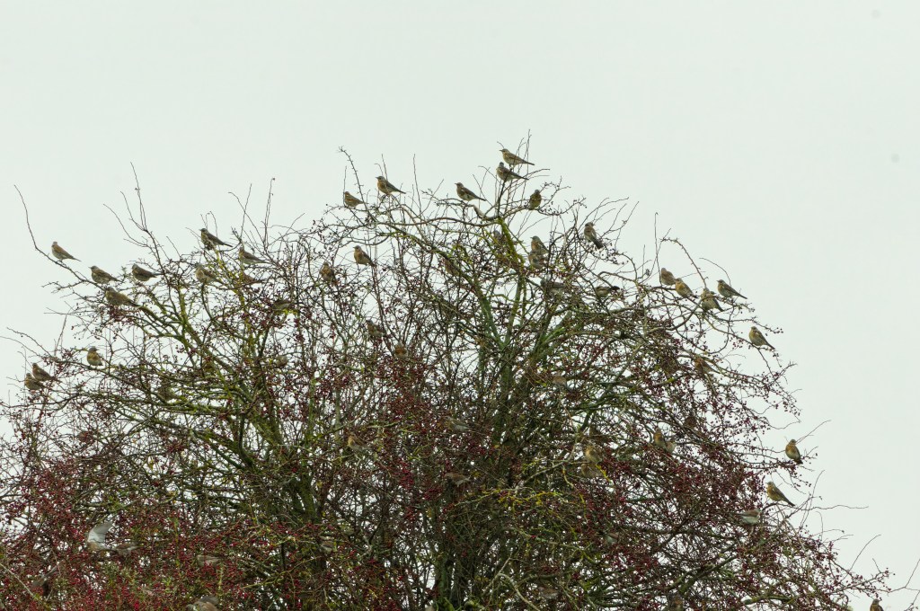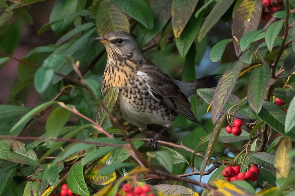 Backwoodsman caught up with Fieldfares again at Barons Haugh in 2019 (a slightly better image), and then in January this year when a group were sitting in a tall tree outside the school in St Peter’s Street and flying to a large and well-laden Cotoneaster in Gladstone Street (it wasn’t possible to get close so there is grain).
