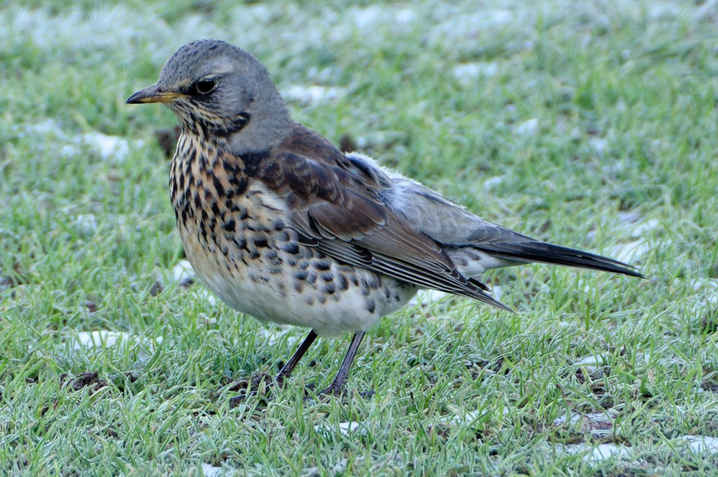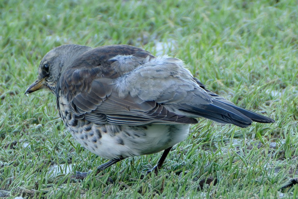 The Fieldfare flew off across the Moss and Backwoodsman carried on walking, hoping to catch up with one or more birds. One walking route skirts the sports fields belonging to the University of Strathclyde and there were Fieldfares foraging on the grass. While these incomers from Fennoscandia are said to favour berries, they are thrushes and are therefore probably pretty good at finding worms and other food on the ground. The light on this patch of grass was undistinguished – oh to have found the Fieldfares in the sunlight which had graced the Loch – so the colours don’t sing. There was the added problem of the University’s rather extra fencing; Backwoodsman is standing back away from the fence, aiming the camera through a gap between bars and waiting for a Fieldfare to hop into clear space, which one of them duly did.
