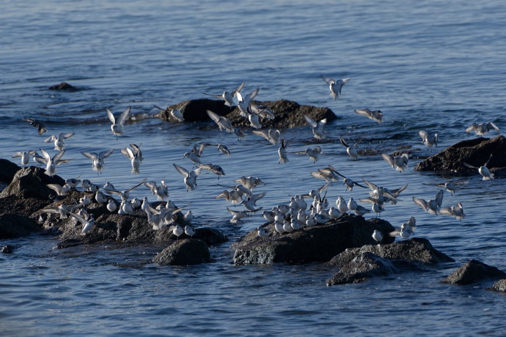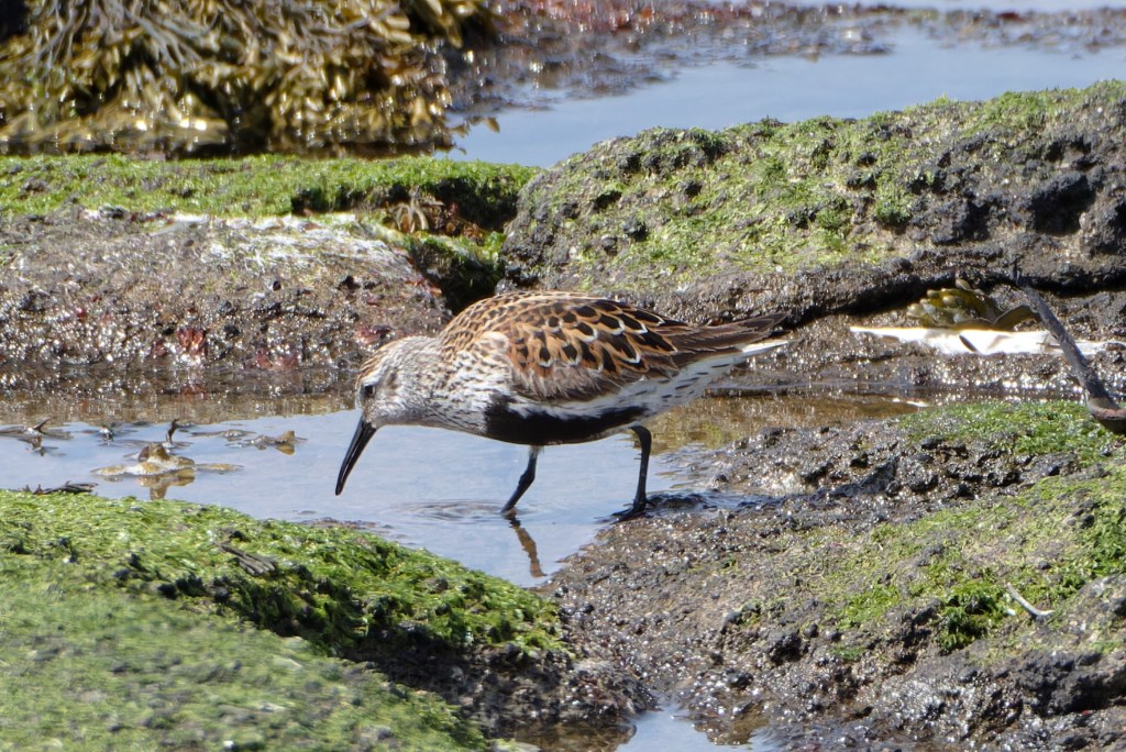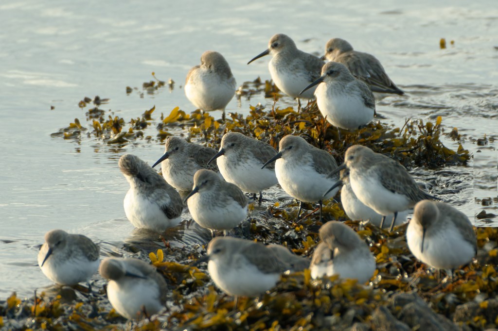 The tide was dropping and the banks of weed just below the old outdoor pool were covered with Dunlin.
