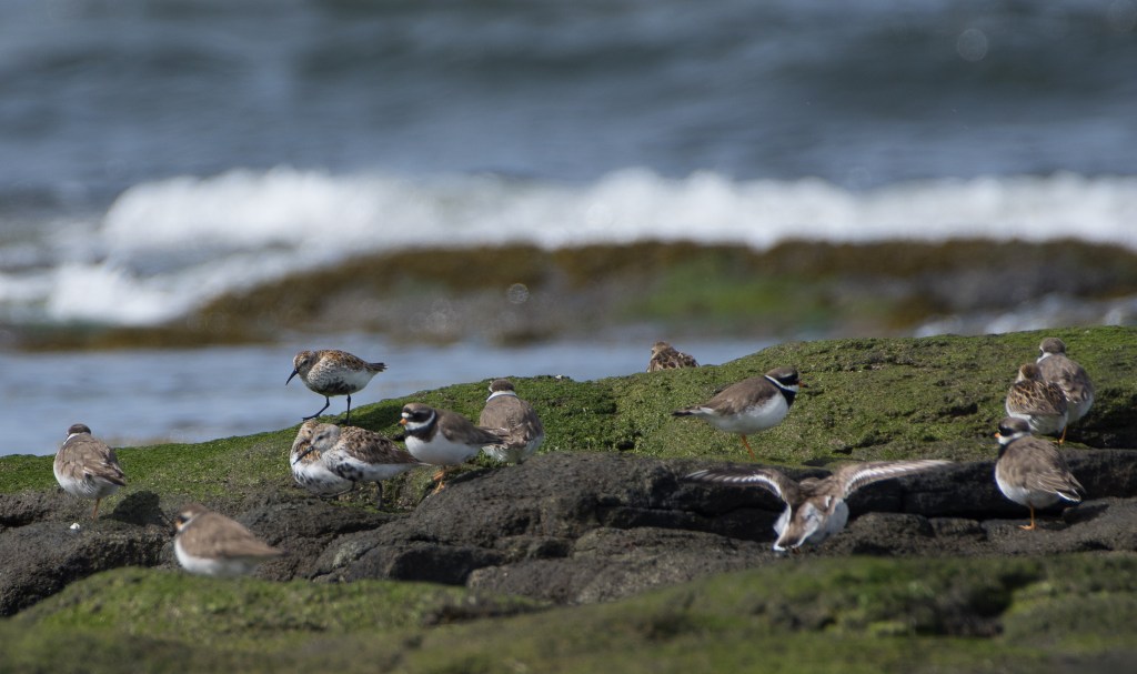 The key feature is the sea wall – it’s great cover. You can go behind it, or you can lie on top of it and try to blend in a bit. The locals will look at you like you’re mad but whatever. If the waves have cast some fresh weed high up the shore, there will be food and cover for the Turnstones, Redshanks, Curlew and Dunlin and they’ll come right up the beach as the tide turns and follow the surf line down. Timing is important. Get it right and you can be right on top of them and they’ll be too busy to notice. And there won’t be dogs harassing them because the dogs are all on the sand further south going doolally.
