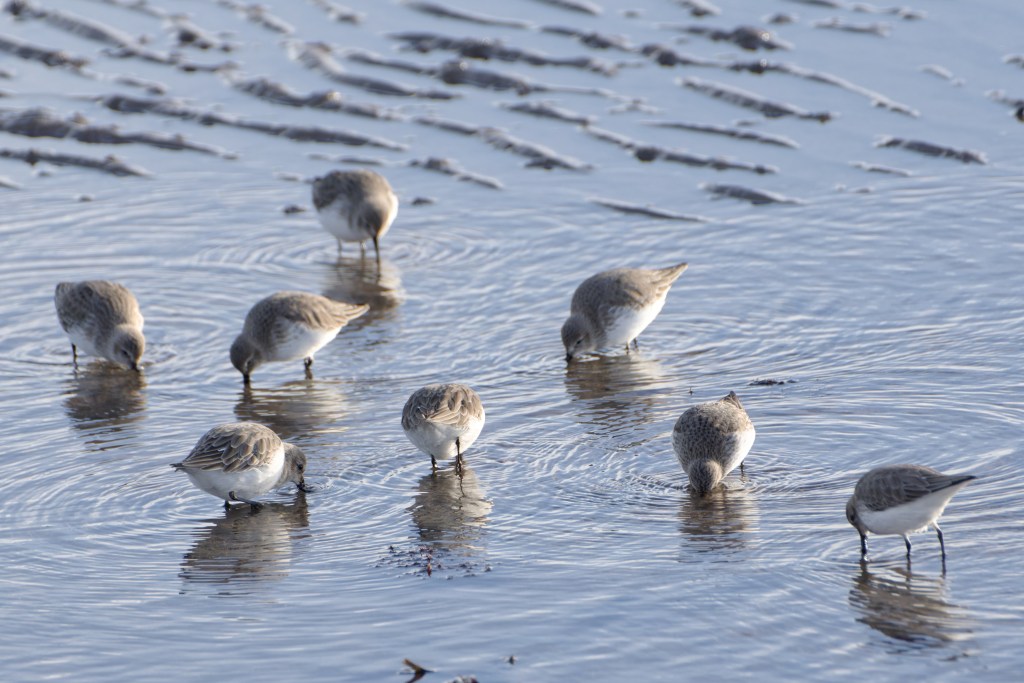 Their diet seems to be well studied; an Icelandic population which over-winters in Africa and uses estuarine sites in Portugal to feed up in transit formed the subject of an open access paper. The authors were able to determine which prey species the Dunlins were consuming; Hediste diversicolor or Ragworm were on the menu, as were juvenile Scrobicularia plana or Peppery furrow shells. The birds also seemed to take species of shrimp. The Supporting Information for the paper contains a series of videos which show the different postures adopted by Dunlin when taking different prey animals. Some of the shells in this pile (the image was taken at the beginning of the day) look like Scrobicularia plana or close relatives.